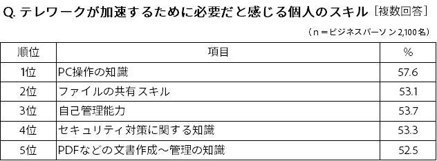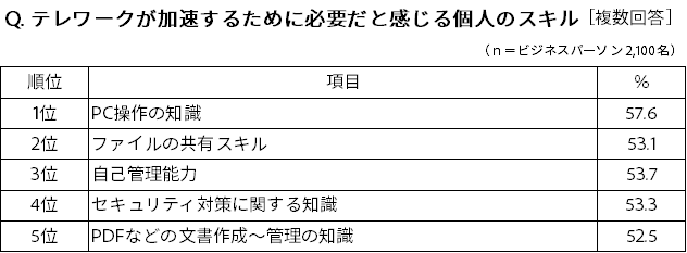 6割以上のビジネスパーソンがテレワークを望んでいる中、今後、テレワークが加速するために必要だと感じる個人のスキルは「PC操作の知識(57.6%)」が最も多く挙がりました。「PDFなどの文書作成~管理の知識(52.5%)」も上位に挙がり、日常的に実施する業務に関連する内容への理解を深めることがテレワークの加速へつながると半数以上の方が考えていることが分かりました。