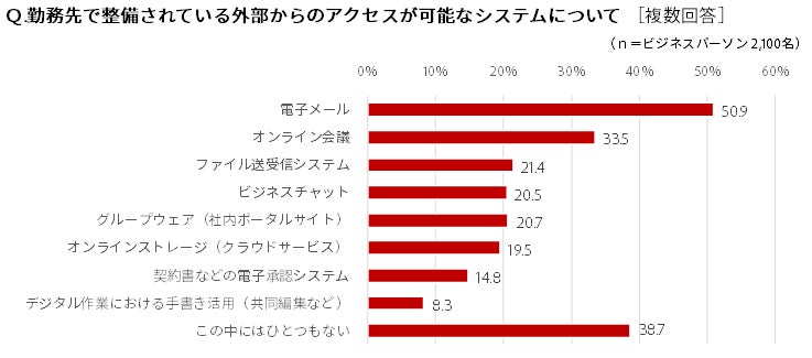勤務先以外からのアクセスが可能なデジタルツールやシステムは、「電子メール(50.9%)」や「オンライン会議(33.5%)」が上位となりましたが、一方で下位の項目は「デジタル作業における共同編集手書き活用(8.3%)」、「契約書など電子承認システム(14.8%)」、「オンラインストレージ(クラウドサービス)(19.5%)」という結果になりました。また、約4割の方は外部からのアクセスが可能なシステムが、選択肢の中には「ひとつもない」と回答するなど、デジタルワークに必要な環境の整備が進んでいない実態が明らかになりました。