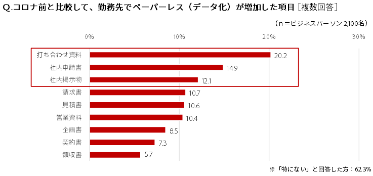 ペーパーレス化(データ化)については、新型コロナウイルス流行以前と比較して、会社内で最も増加した項目は「打ち合わせ資料(20.2%)」が最多となりました。テレワーク実施企業に絞ってみると、42.4%に上り、打ち合わせ資料はオンライン上で共有されるなど、デジタル化が進んでいるようです。また、「社内申請書」や「社内掲示物」など、社内資料もペーパーレスが増加していることから、まずは社内関連のものからペーパーレス化を進める傾向にあることが分かりました。