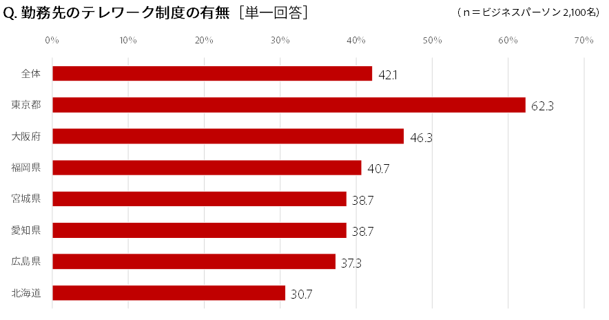 勤務先である会社のテレワーク制度の導入状況を見てみると、「現在テレワークの制度がある会社」は調査対象全体の半数弱の42.1%という結果になりました。地域別に見ると、東京都だけが62.3%と過半数を超えていますが、続く大阪府、福岡県、宮城県、愛知県、広島県、北海道はいずれも5割を下回っています。例として東京都と北海道を比較すると、制度の有無に30%以上ギャップがあり、柔軟な働き方の推進度合いは、地域間によって大きな差があることがわかりました。