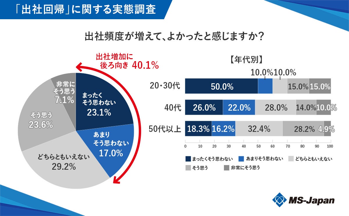 続いて、「出社増加の感じ方」については、出社頻度が増えたことに対して否定的な回答が40.1%にのぼり、特に20代・30代ではその割合が60.0%と、過半数を占めました。
