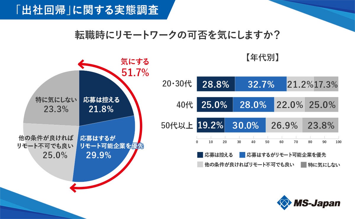 特に20〜30代では、「応募を控える」や「できればリモート可能な企業を優先したい」と回答した人が61.5%に達しており、若年層ほどリモートワークの可否を気にする傾向が強いことが明らかになりました。