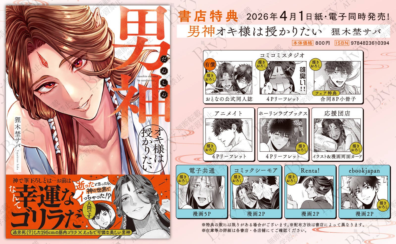 逝ったと思ったら、神の世界でイっちゃった!?社畜×男神BL! 狸木埜サバ『男神オキ様は授かりたい』が4月1日発売!