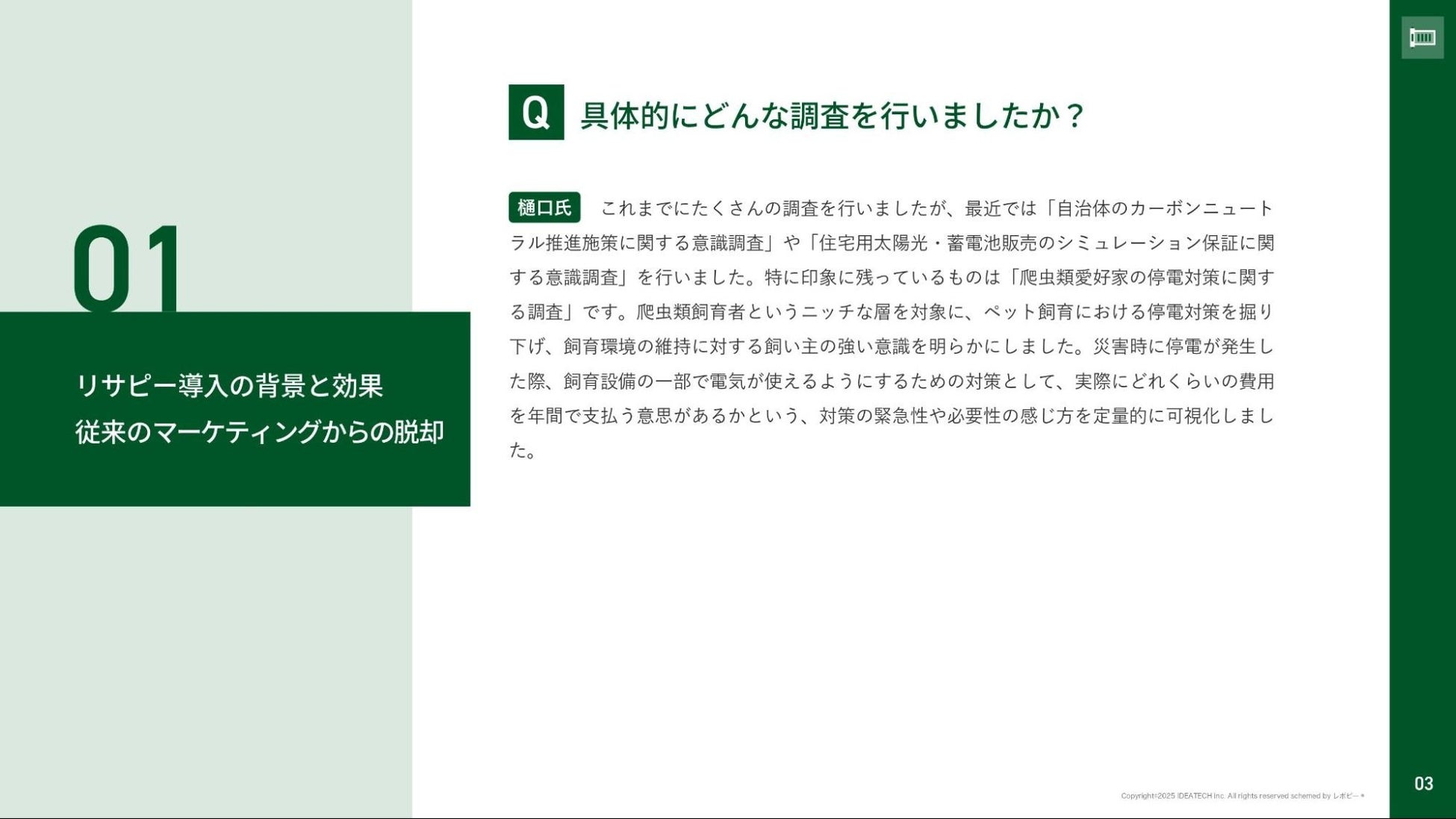大企業向けに調査やエビデンスを提供する活動が効果的ではないかと考え、まず他社で 1 回調査を行いました。その後「リサピー®️」と出会ったのですが、「リサピー®️」は従来の調査会社とはコストが大きく違いました。従来の調査会社だと 1,000 サンプルで 150 万円から 300 万円かかるところ、「リサピー®️」なら 25 万円から 45 万円程度です。また、調査からプレスリリースまで全部お任せできる点も魅力でした。さらに、「リサピー®️」はカジュアルでフレキシブル、ノリがいいんです。普通の調査会社では難しい柔軟な対応をしてくれました。