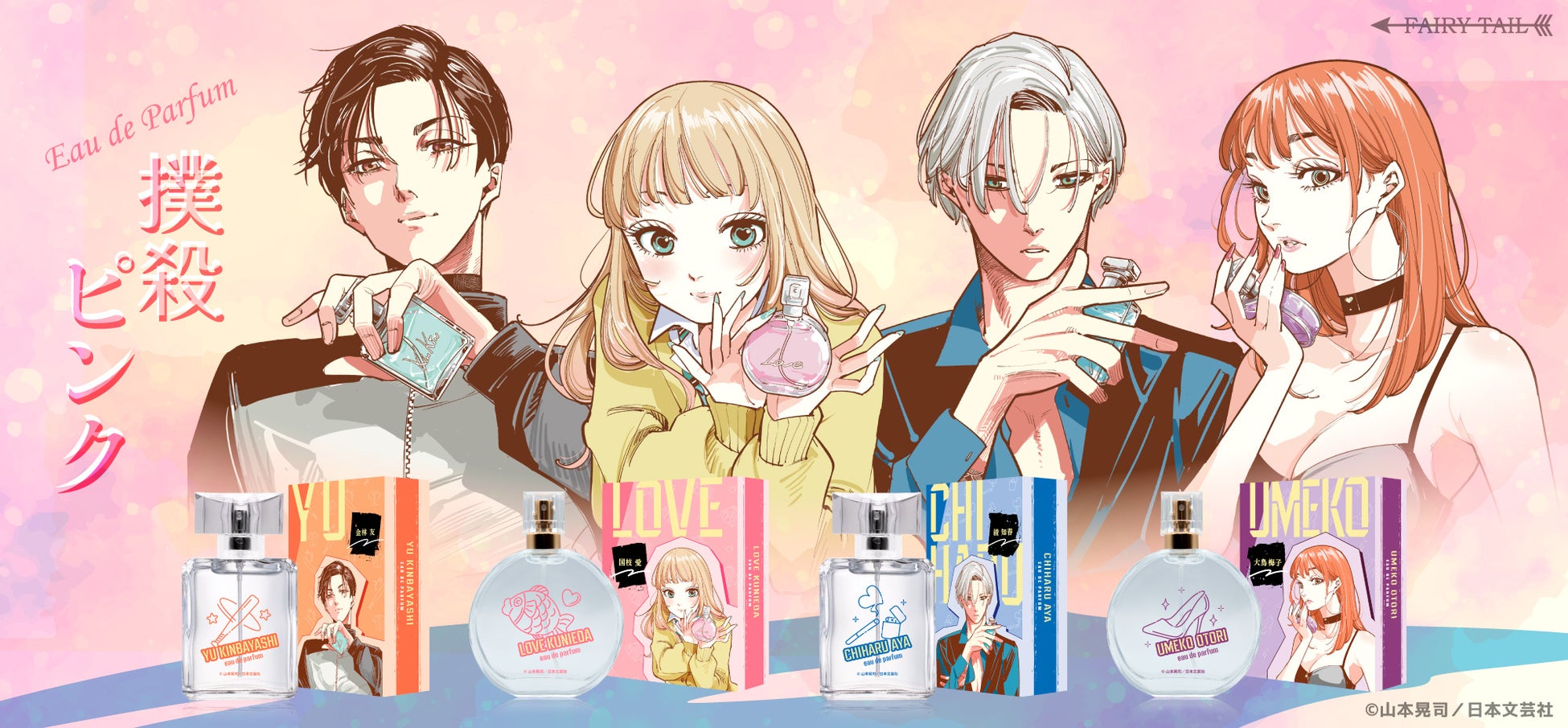 『撲殺ピンク~性犯罪者処刑人~』の人気キャラクター国枝愛、金林友、綾知春、大鳥梅子をイメージした香水が登場!