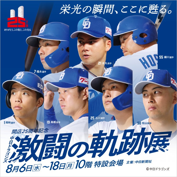 総展示点数100点以上となる展覧会「開店25周年記念 中日ドラゴンズ 激闘の軌跡展」の開催に合わせ、ジェイアール名古屋タカシマヤ全館で様々なイベントを行います。