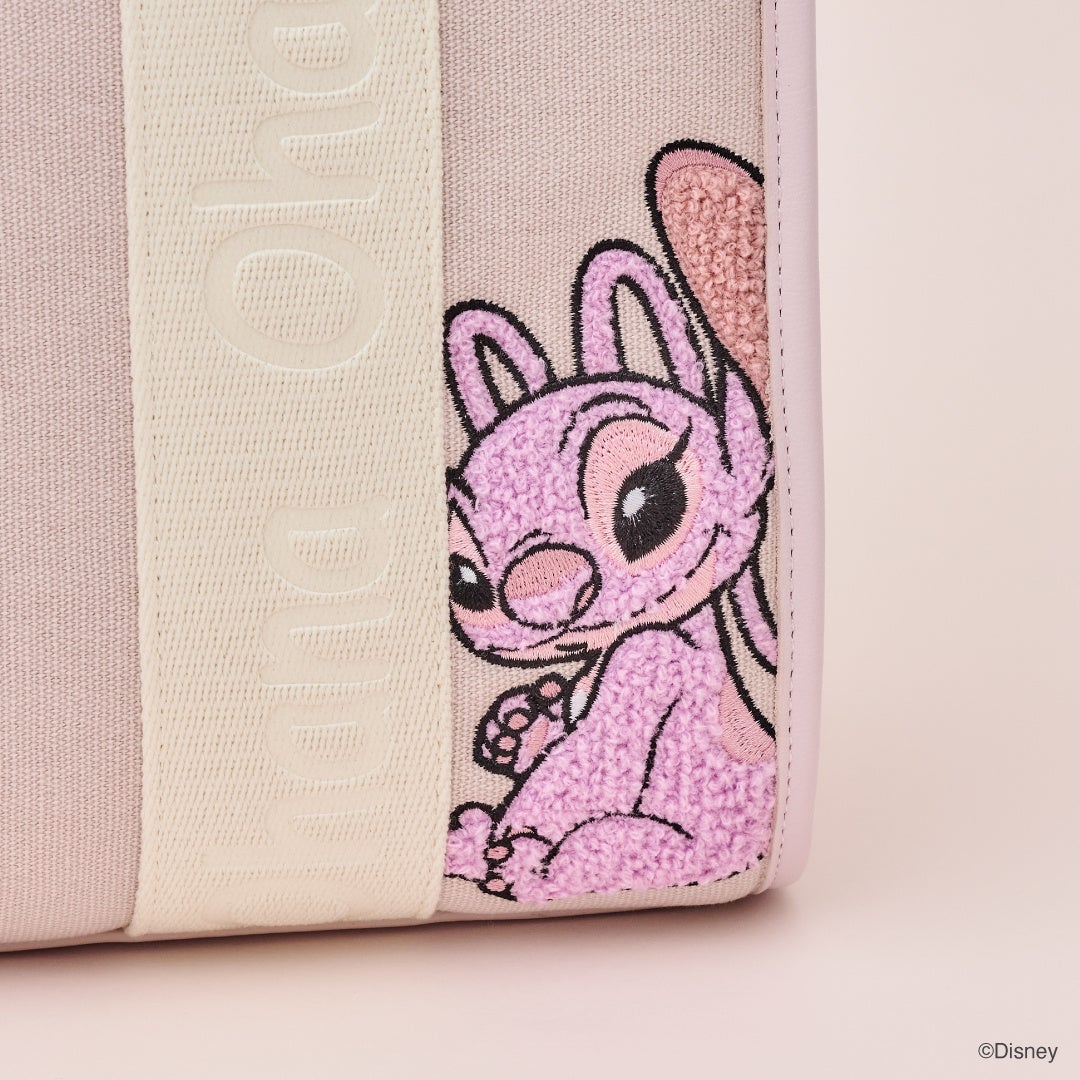 「エンジェル」の決めポーズを凹凸感のある立体的な刺繍でデザインされたバッグ。バッグ全体のカラーも「エンジェル」をイメージしたピンクよりのラベンダーカラーで表現。内側にもオリジナルの総柄デザインを施し、どこから見ても世界観を感じられるアイテムです。