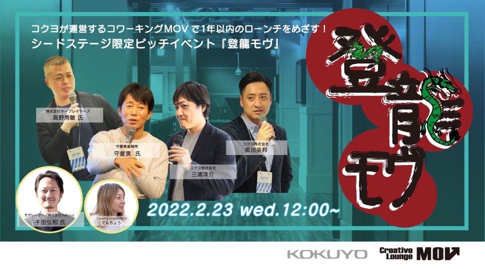 2022年4月に10周年を迎えるMOVが、次の10年を起業見据えて新たに取り組むスタートアップ支援、登龍門ならぬ『登龍モヴ』は、シードステージ限定のピッチイベントです。優勝者は、コワーキングスペースを1年間利用できるほか、会社設立のための支援や、MOVオウンドメディアでの発信、審査員もつとめる日本屈指の投資家たちのメンタリングなど、全面的なバックアップをご用意。この1年でかならずローンチさせる!というスタートアップの気迫をご覧ください。