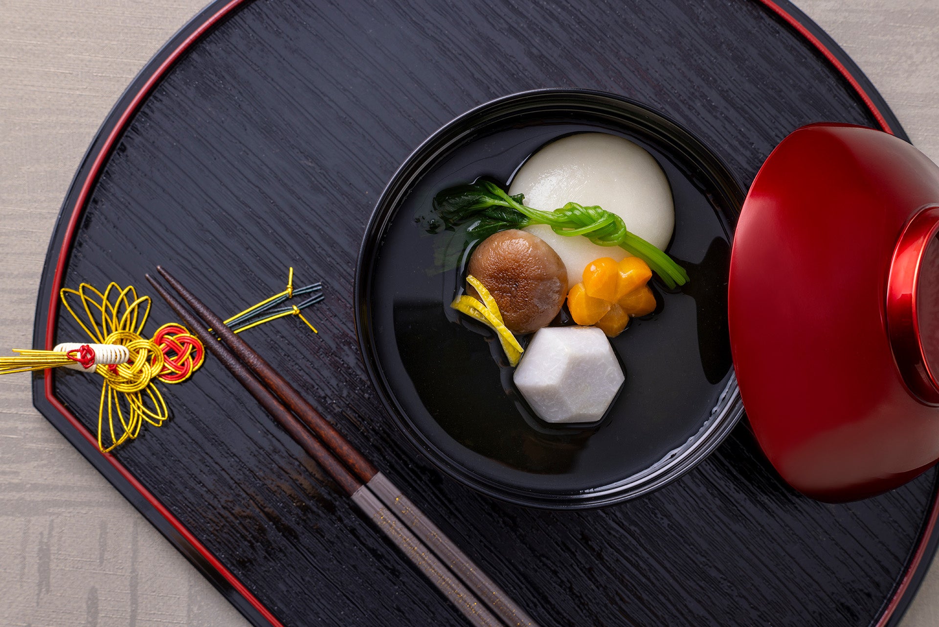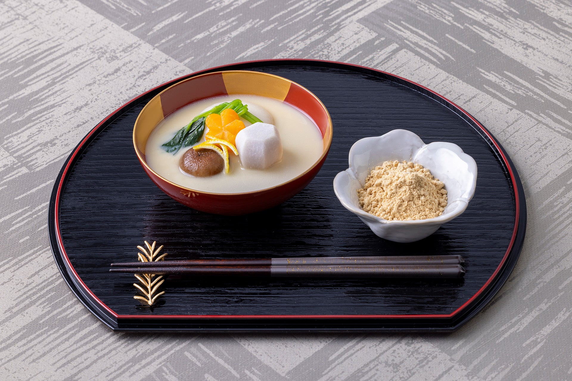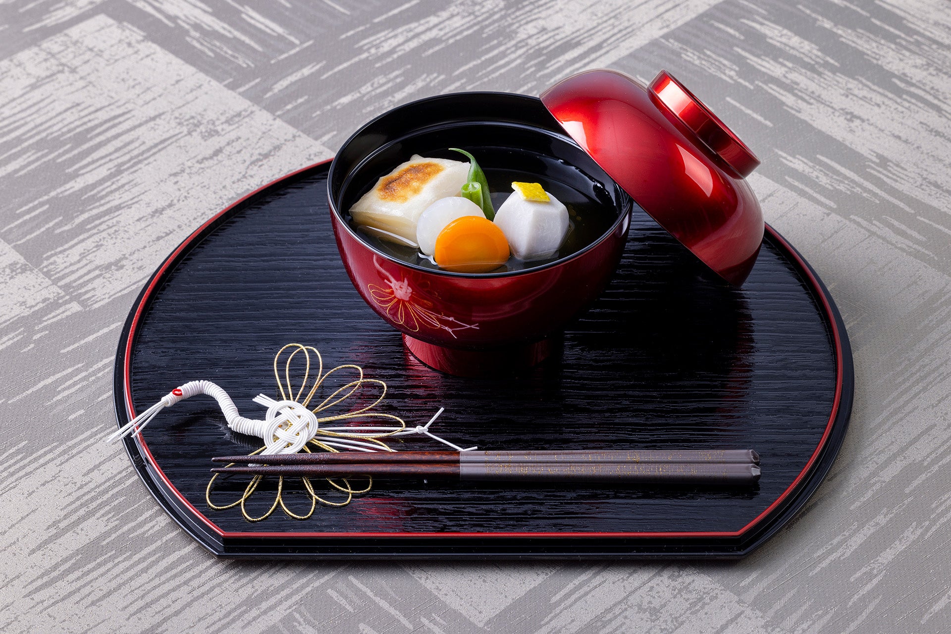富山湾の鰤と鶏の旨味がきいたすまし仕立ての出汁と、お祝いを表す紅白の白玉が特徴のお雑煮。