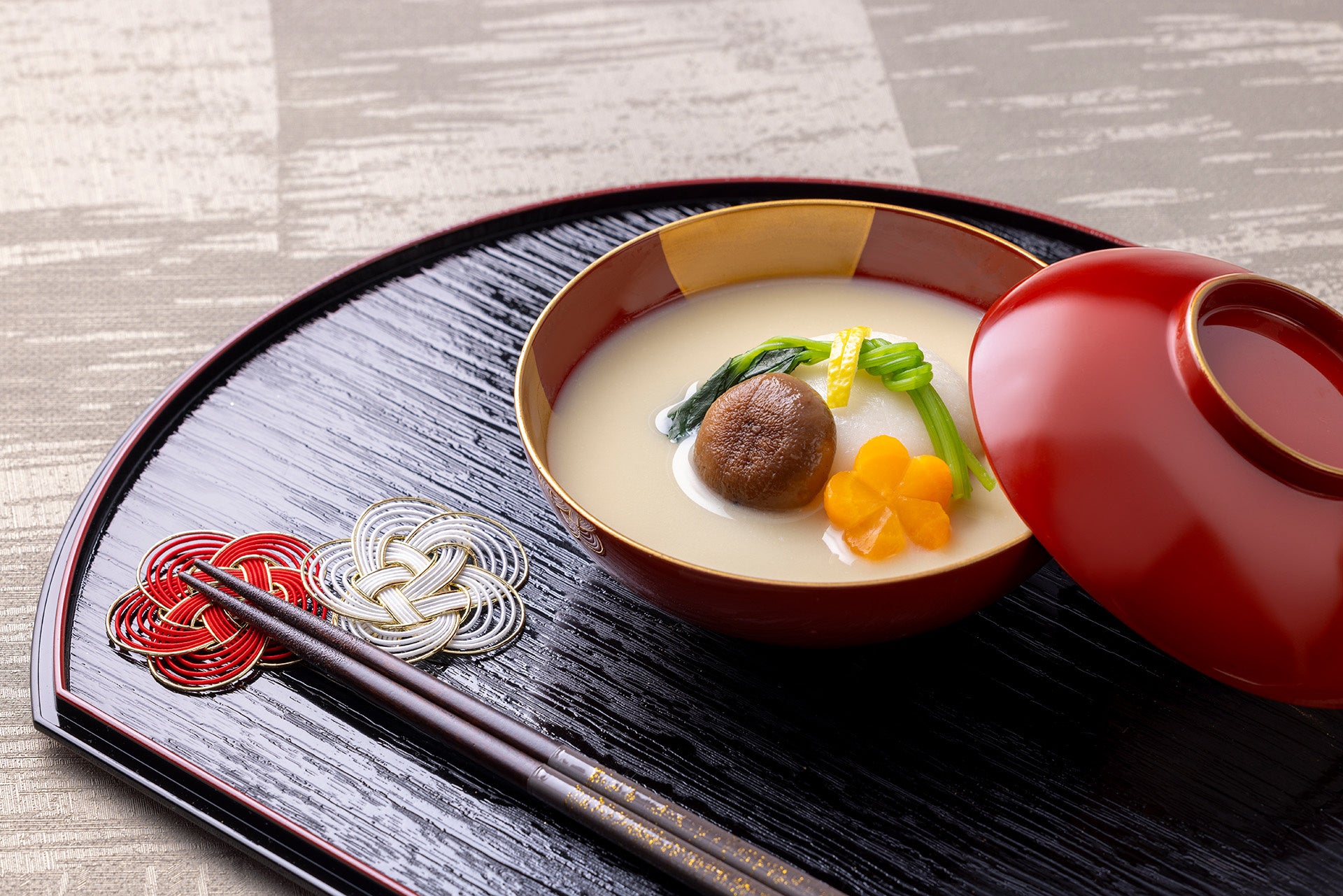 ホテル近隣の町、鰹節発祥の地でもある和歌山県印南町(いなみちょう)では、お雑煮に鰹節を添えて新年をお祝いする風習があります。お好みで追加していただけるよう、トッピング用の鰹節を用意しました。また、関西風に餅は丸餅、紅白大根人参、味噌は地元「やまだ」の白味噌を使用しています。