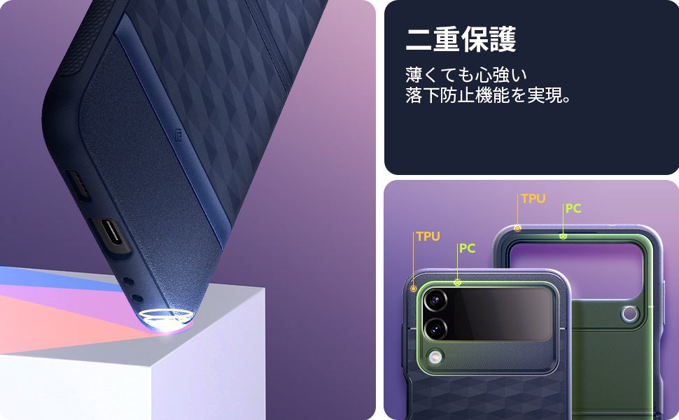 また、デバイスの折りたたみにも、きちんとフィットするよう専門技術を基に設計されました。外部は柔軟性のあるプレミアムTPU素材を、内側とLCDやカメラ周りにははハードなPC素材を採用したハイブリッド構造ケースです。