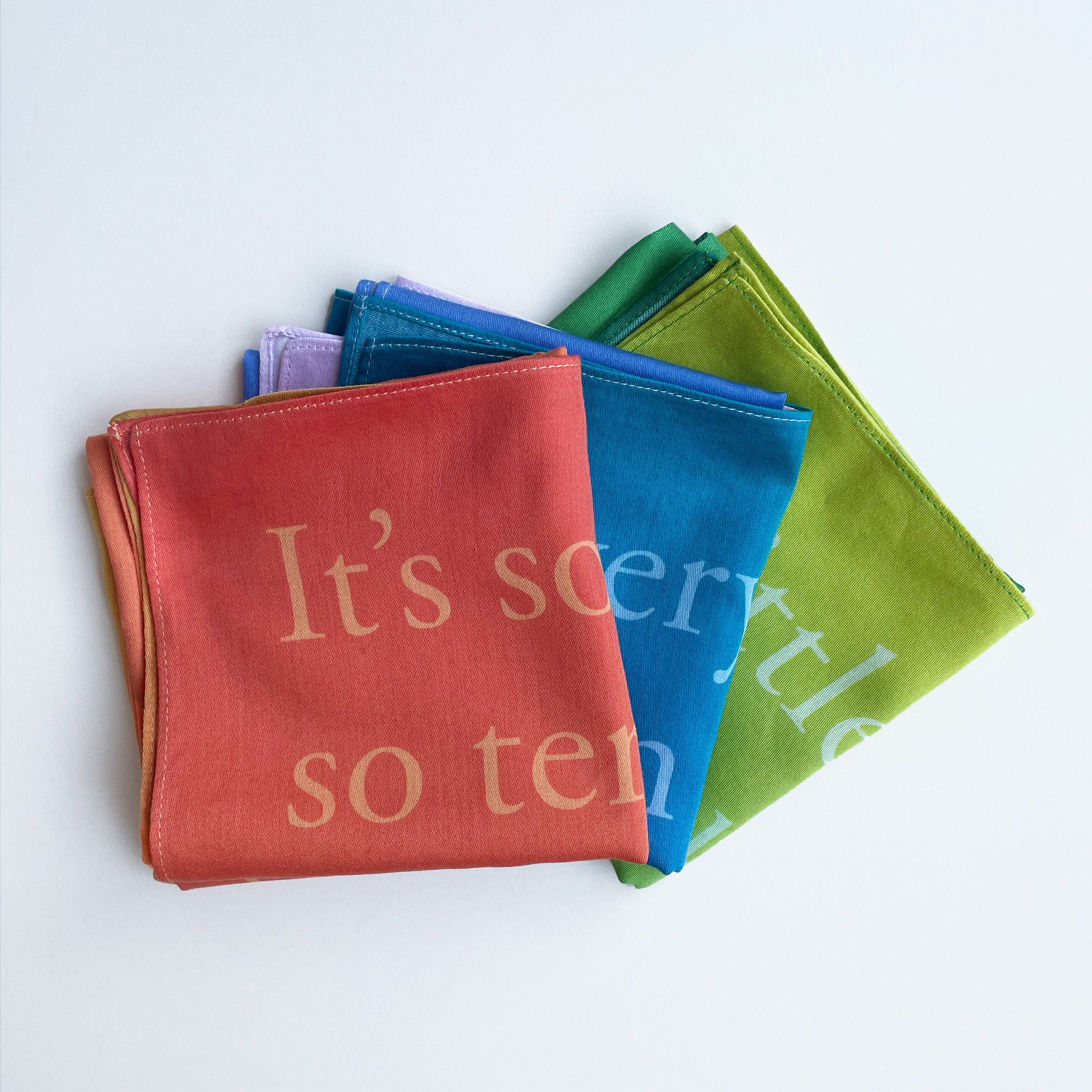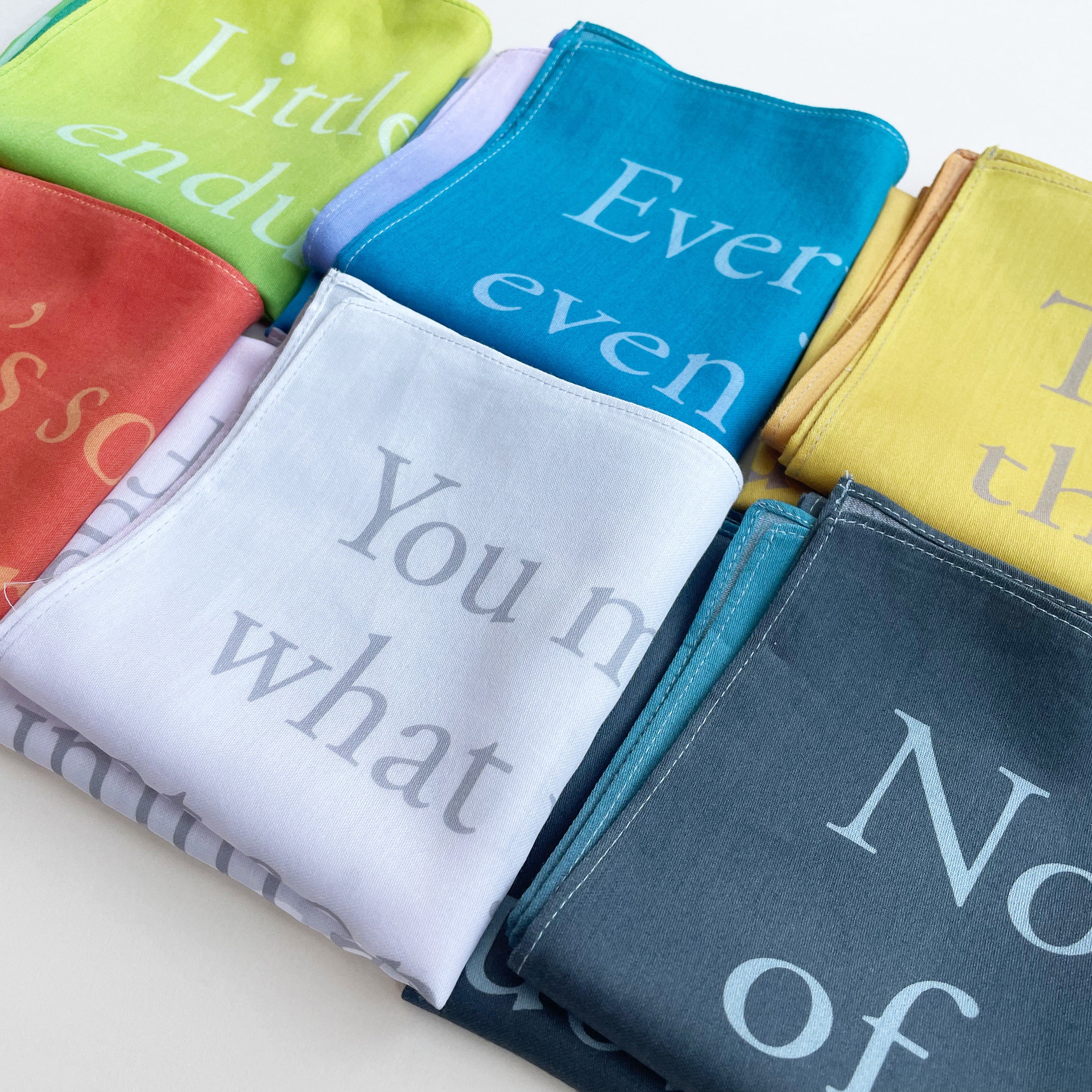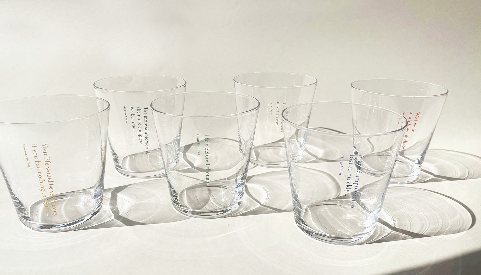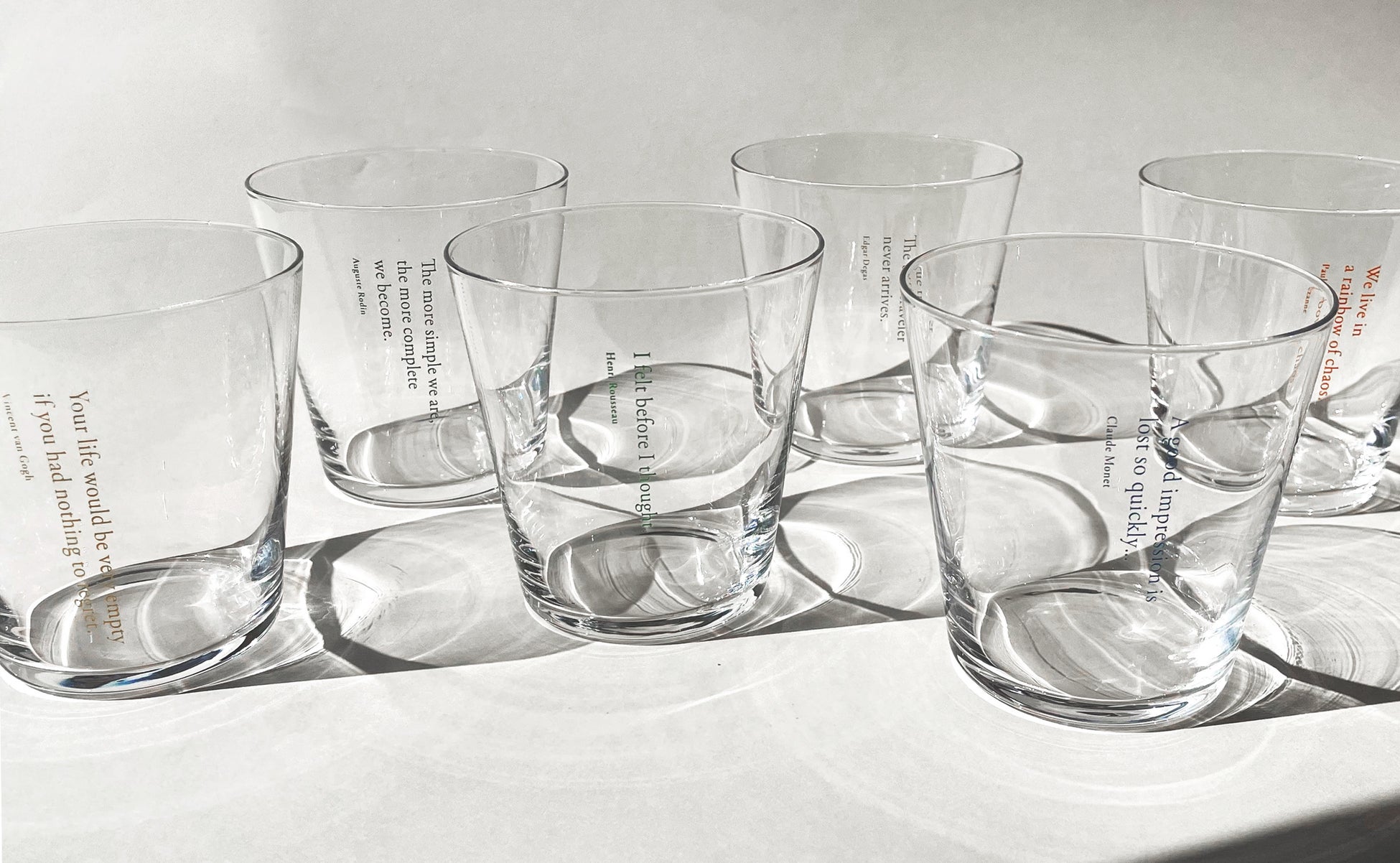 今回展開するアイテムは、日常使いにも、ギフトにもぴったりなハンカチ、グラス、トートバッグ、ボンボンキャンディの4つ。それぞれの代表作からイメージしたキーカラーとメッセージを上品なデザインに仕上げました。