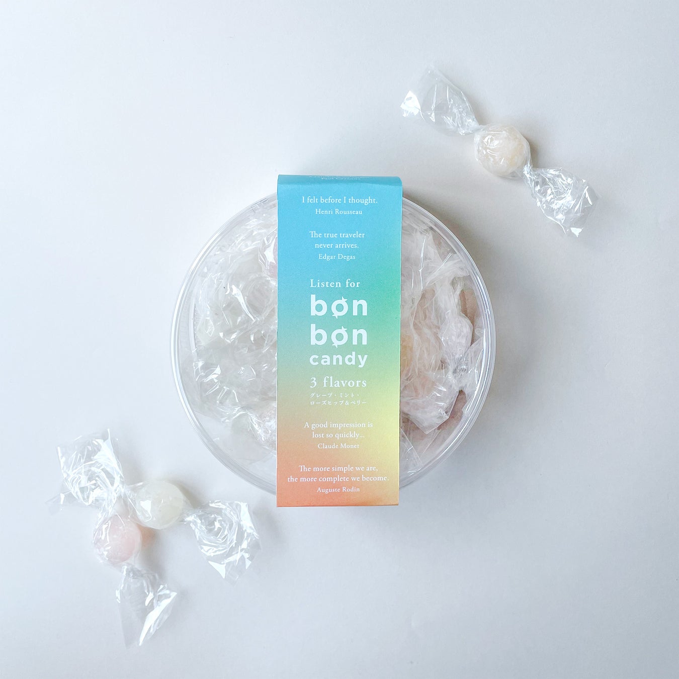 そのほか、サブバッグとして使いやすい大きさの6色展開のトートバッグ(1,980円/税込)と、ガラスのように美しく繊細で、噛めば中からトロッと優しいフレーバーが溢れ出す3種の味(グレープ、ミント、ローズヒップ&ベリー)のボンボンキャンディ(1,296円/税込)も展開いたします。
