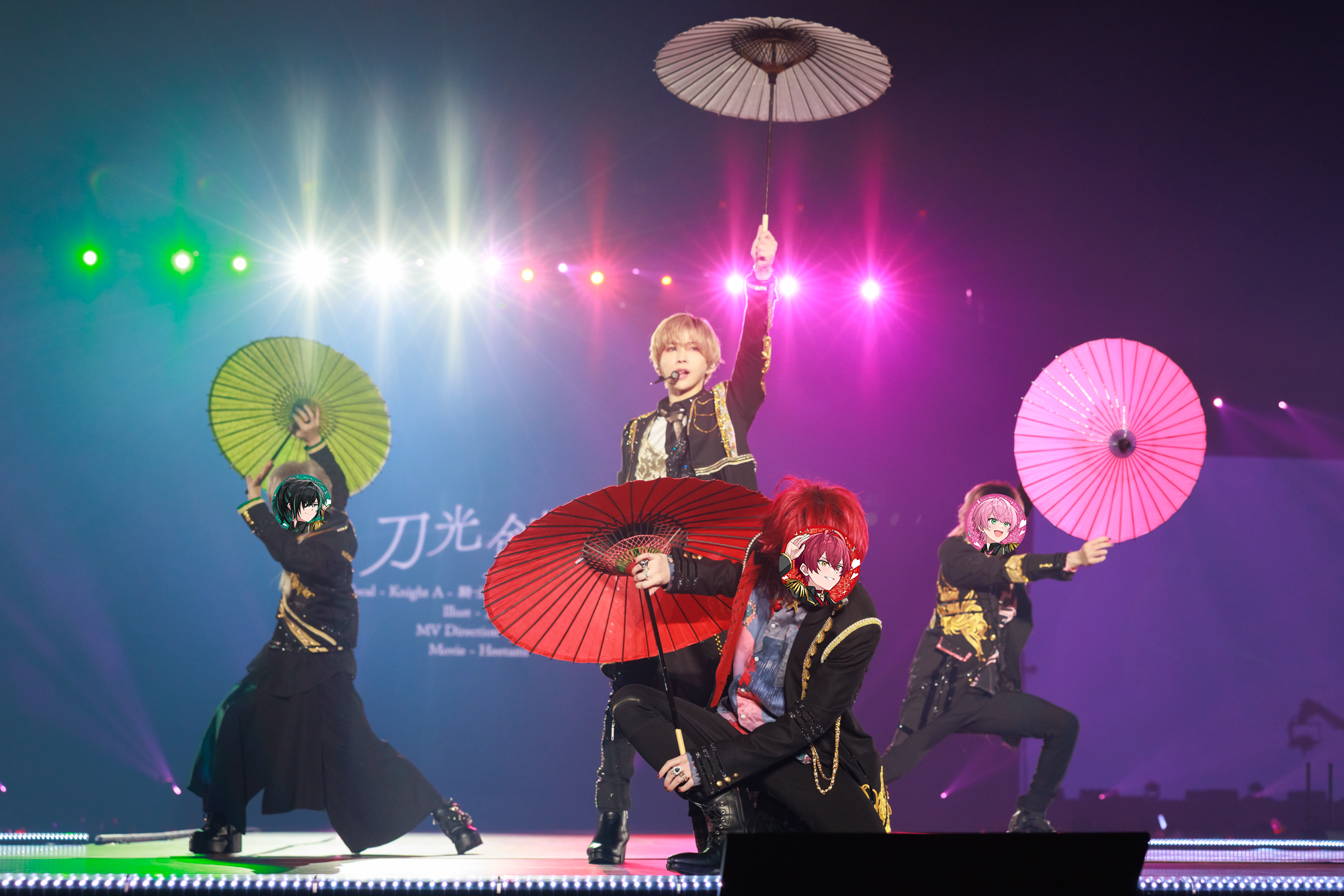 純白をベースにゴールドのアクセントが施された王子様衣装で現れたすとぷりが最初に披露した「プロポーズ」は、結成5周年記念に公開されたリスナーに永遠の愛を誓うセレブレイトソング。指輪を思わせる可愛らしい振り付けに魅了されるその証明が、ドーム全体を覆った無数のカラフルなペンライト溢れる高らかな歓声だ。不動のアイドルらしさは、新しい歌い手グループの礎を築いた彼らの努力があってこそのものだろう。ファイヤーボールやスパークラーの派手な演出が飛び交うトリガーを引いたのは、Knight A - 騎士A -のエッジの効いたダンスチューン「EDEN」。背中に見えるはずのないセクシーな火花が散っていた彼らの圧倒的な歌声から、グループとしての“使命感”が存在していた。ここで、遊び心たっぷりに降り立ったAMPTAKの「AMP-ATTACK!」、まだ若手のめておらの「SIx Kick Ass」と、ライブに相応しいアグレッシブな2曲が続く。どちらも自己紹介ラップパートが際立つナンバーで、大音量のコール&レスポンスが生まれていった。無機質だがどこか魅力的な声色が特徴的なめておらのメルト・ダ・テンシの声をはじめ、STPR所属のメンバーは、一人ひとりの声が個性的。生まれや育ちの違いはもちろんあるが、“声”に秘められた魅力の重要性の高さをあらためて確認した。