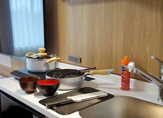 旅先であっても、いつもの健やかなリズムを大切にしていただきたい。そんな想いから、すべての客室に「洗濯機」「電子レンジ」「2 ドア冷蔵庫」を標準完備しています。さらに、55 インチの大型スマートテレビや物干しスペース、空間を広く使えるベッド下のキャリーケース収納など、細部にまで使い勝手を追求しました。こうした設備と工夫により、客室内で洗濯、お食事、仕事、くつろぎまでを1つの空間で叶えます。ビジネスの合間にも自分のペースを崩すことなく、 “ホテルで暮らす滞在”をお楽しみいただけます。