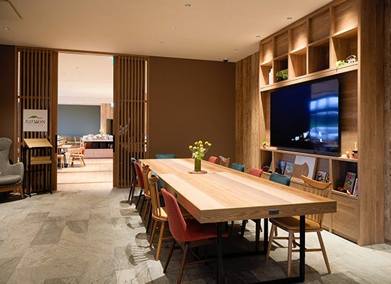 2階にはフロントを備えたロビーラウンジを設け、南阿蘇の檜の森をイメージした落ち着きある空間に仕上げました。お待ち合わせやご滞在中のくつろぎのひとときにご利用いただけます。また、同フロアには会議室(22m²)も併設しており、ビジネス用途にも対応しています。