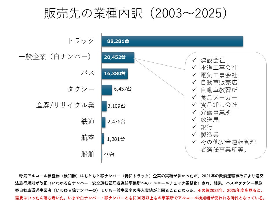 本資料は⾃社製品に限っての情報ではあるものの、業務⽤アルコール検知器の黎明期から、2011年の緑ナンバーのアルコール検知器義務化前後、2023年の⽩ナンバーアルコール検知器義務化前後等、市場の変化を概況的に表しており、⾏政、消費者におかれましては、「呼気アルコール検知器の産業史」と捉え、より⼀層「飲酒運転防⽌機器」の社会的存在意義を感じ取っていただければ幸いです。
