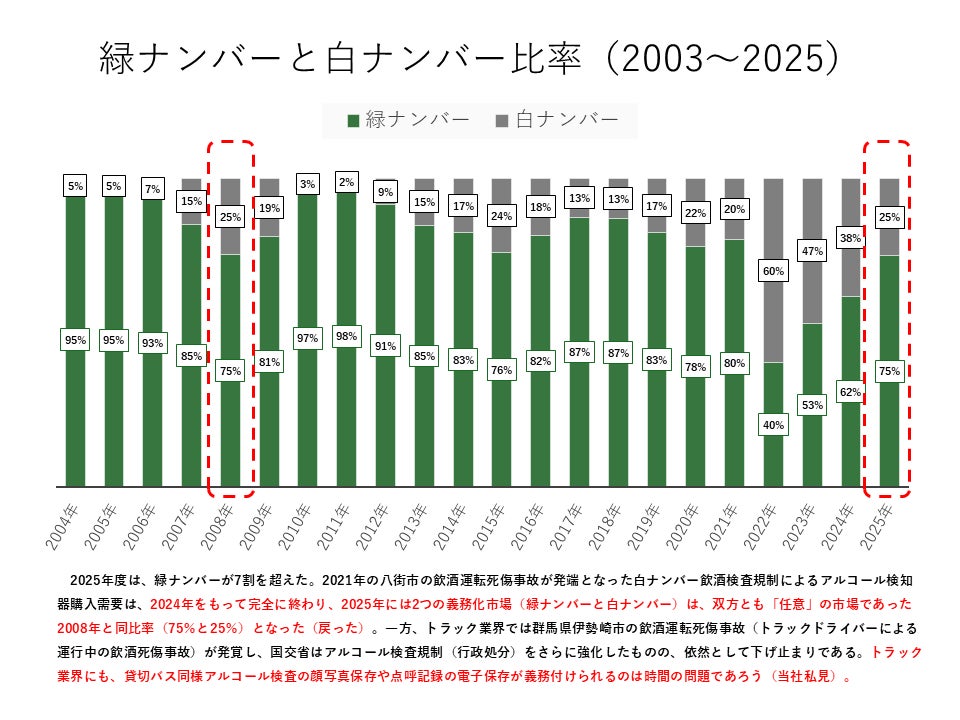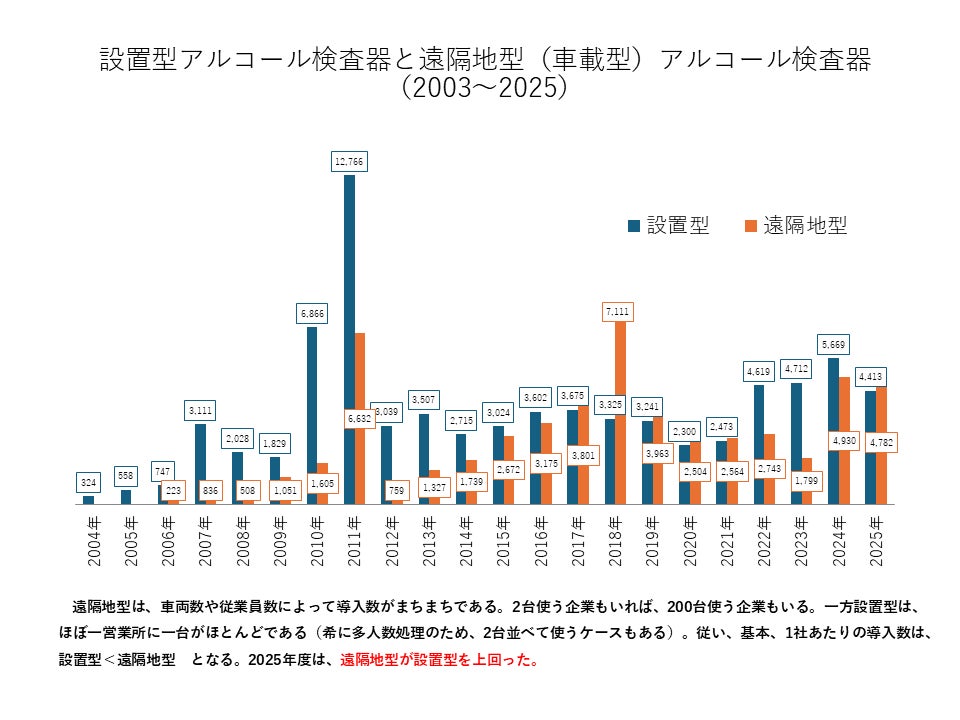本レポートは、当社の呼気アルコール検知器の2025年度の単年実績および2003年に発売してから22年間の実績を、業種や機種ごとに取りまとめてお知らせするものです。 当社の呼気アルコール検知器の導⼊実績は累計13万台を超えました。設置型・遠隔地型、機種別等、記録型等、さまざまなタイプのアルコール検知器のそれぞれの販売トレンドや、業種ごとの導⼊傾向等をご確認いただけます。