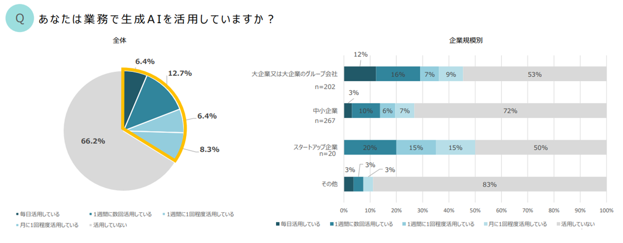 所属企業において、「業務で生成AIを活用していますか?」と尋ねたところ、全体の33.8%が、「月に1回以上生成AIを活用している」と回答しました。企業規模別での活用率は、スタートアップ企業(50%)、大企業(44%)、中小企業(26%)となり、スタートアップ企業では、全体の約半数が積極的に生成AIを業務に取り入れているということが伺えます。