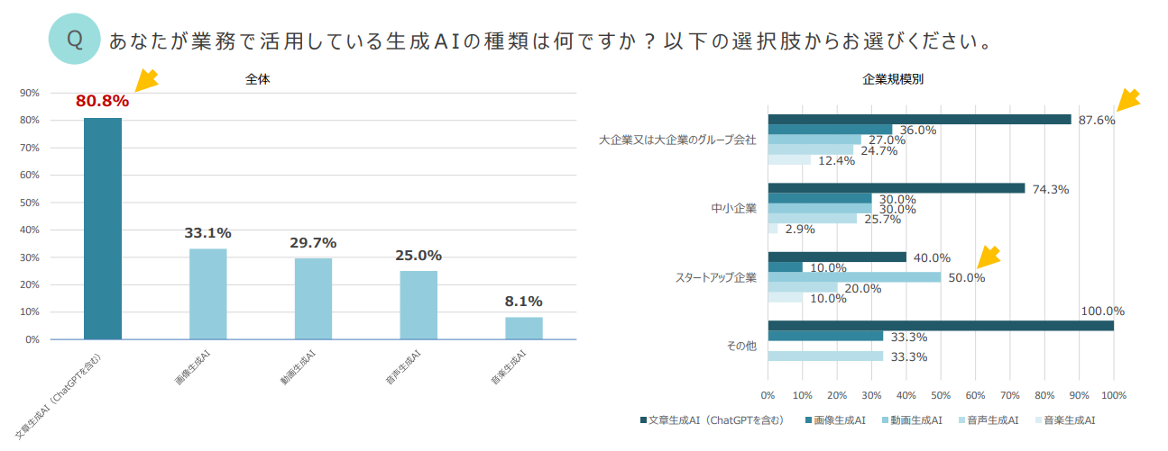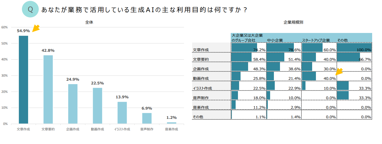 また、「利用目的が動画の作成である」という回答を企業規模別でみると、大企業では25.8%、スタートアップ企業では40%となり、スタートアップ企業では動画作成が利用目的という比率が比較的高いことが分かりました。