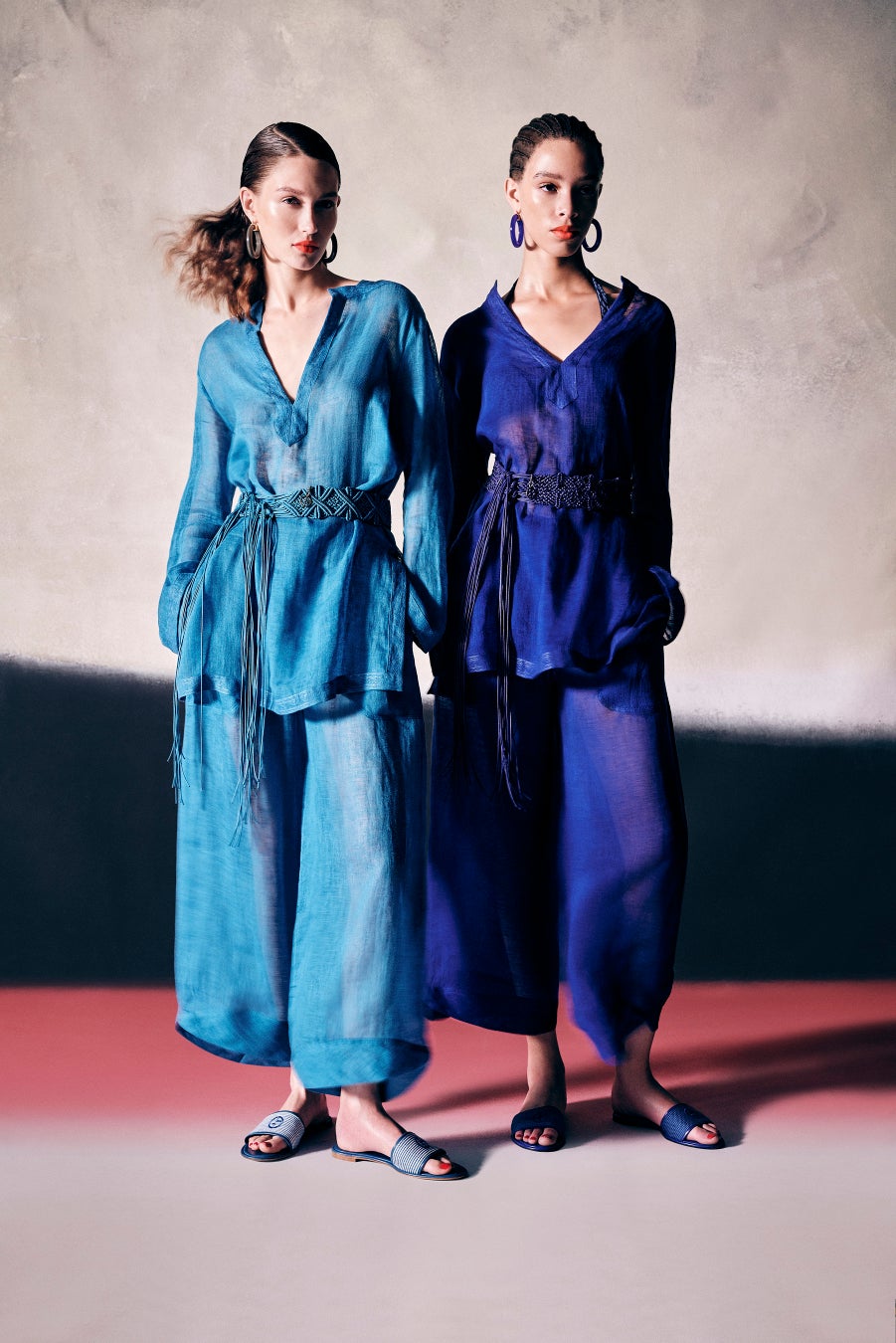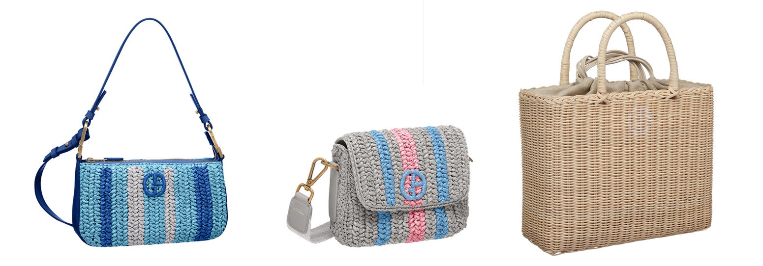 ウィメンズコレクションは、夏の日差しに映えるリネン素材のシャツやワンピース、パンツ、ロングドレス、ショートパンツなどのアイテムが、ブルー、パープルなどの鮮やかなカラーバリエーションとともに展開されています。スイムウエアとしても着用できるワンピースタイプのボディスーツやショートパンツとセットになったトップスは、遊び心のある結び目や透け感のあるパーツ、ジャガードで表現された総柄の「GA」ロゴが印象的です。また、ジャケットをドレスの上に羽織れば、イブニングシーンにも映えるエレガントなスタイルが完成します。アクセサリーは、ラフィア素材のアイコンバッグ「ジョルジオ アルマーニ ラ プリマ」をはじめ、ハット、サンバイザー、スカーフ、エスパドリーユなどリゾートに最適なアイテムが揃います。
