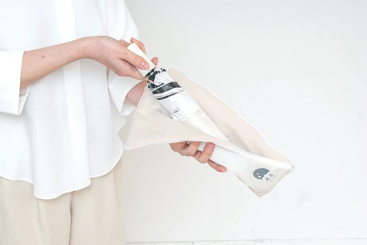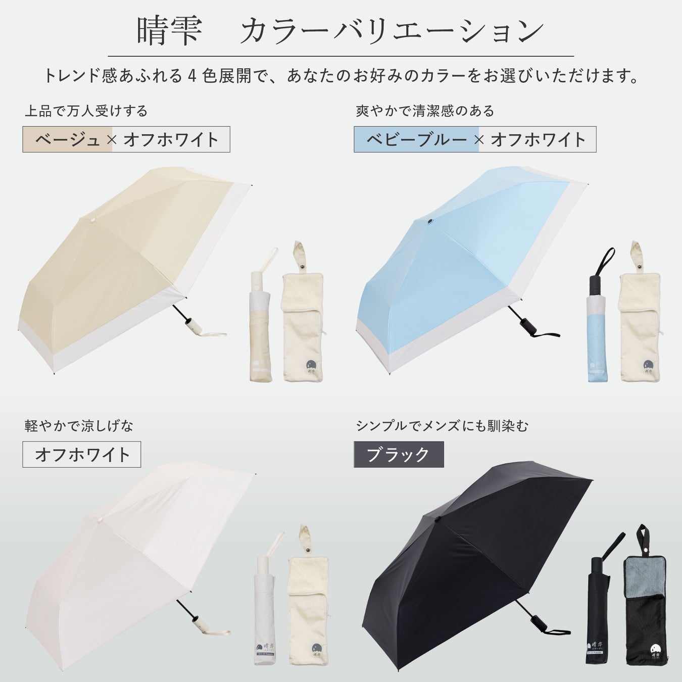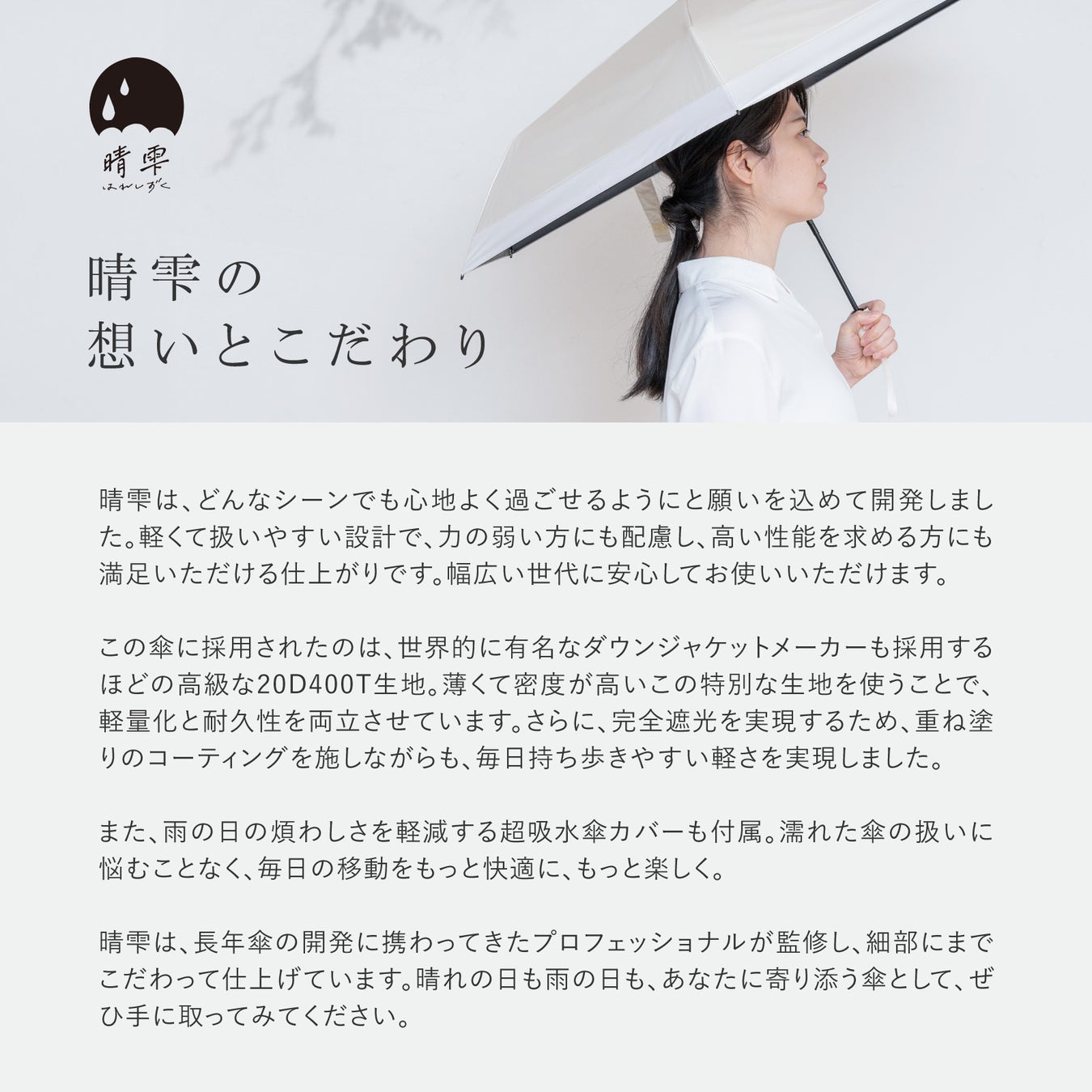 「晴雫」は、強い日差しをカットしつつ、急な雨にも対応できる晴雨兼用仕様。さらに、付属の超吸水傘カバーで、濡れたままでもさっと収納でき、電車や車、室内でも快適に持ち運べるのが特徴です。