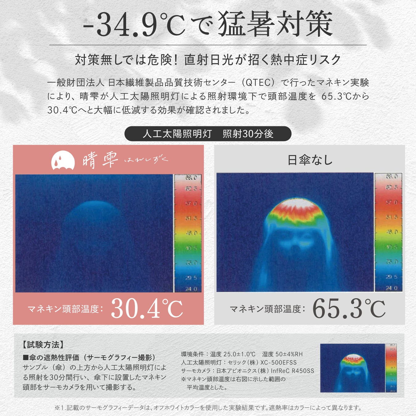 一般財団法人 日本繊維製品品質技術センター(QTEC)で行ったマネキン実験により、 晴雫が人工太陽照明灯による照射環境下で頭部温度を65.3℃から30.4℃へと大幅に低減する効果が確認されました。