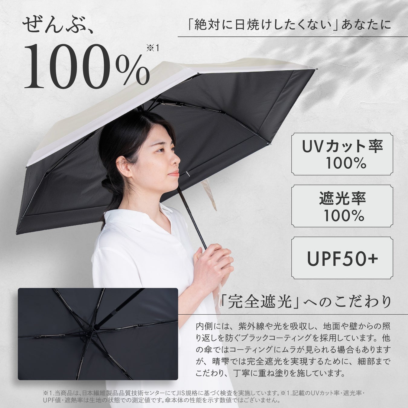 UVカット率100%、遮光率100%、UPF50+の性能で、紫外線や日差しをしっかりブロックします。内側には、紫外線や光を吸収し、地面や壁からの照り返しを防ぐブラックコーティングを採用しています。