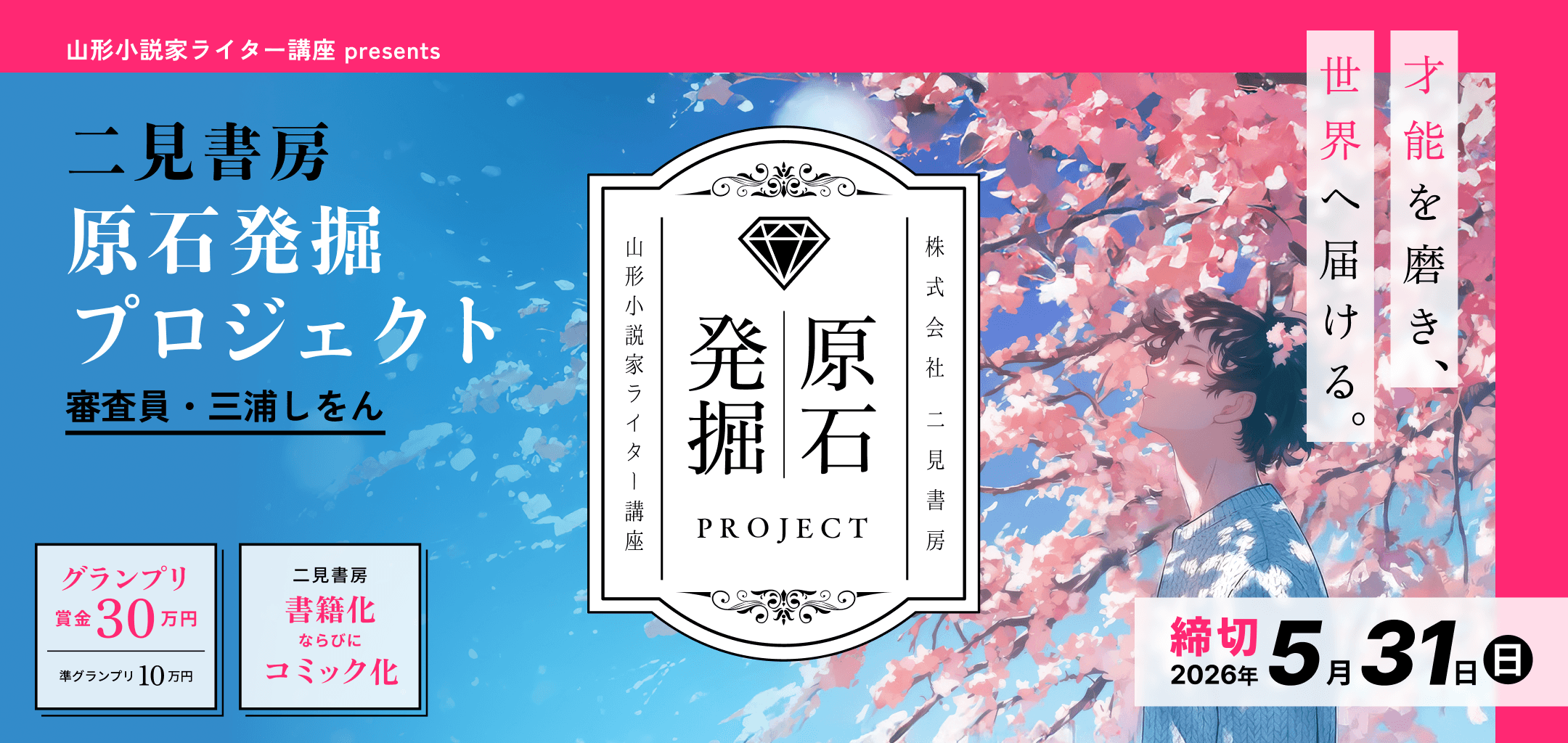 株式会社二見書房は、数多くのプロ作家を輩出してきた「山形小説家・ライター講座」(山形県山形市)と共同で、2026年4月より「二見書房 原石発掘プロジェクト」を開催します。