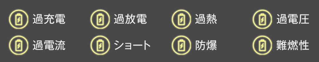 過充電や過熱などの多くバッテリートラブルに対する安全保護機能を搭載しておりバッテリーを保護します。