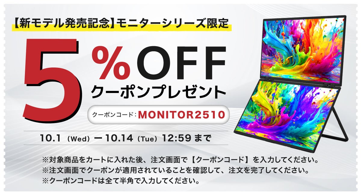 モニターシリーズの新モデルを発売することを記念して、公式通販サイトでは期間限定でシリーズ商品全品5%OFFのクーポン配布キャンペーンも開催