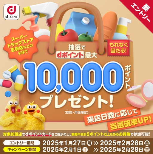 株式会社NTTドコモ(以下、ドコモ)は、対象のdポイント加盟店(街のお店・ネットのお店)※1をご利用いただくと、抽選で10万名さまにdポイント(期間・用途限定)※2が最大で1万ポイント当たる「抽選で最大1万ポイントが当たる家計応援キャンペーン!」(以下、本キャンペーン)を、2025年2月1日(土)から2025年2月28日(金)までの期間で開催いたします。