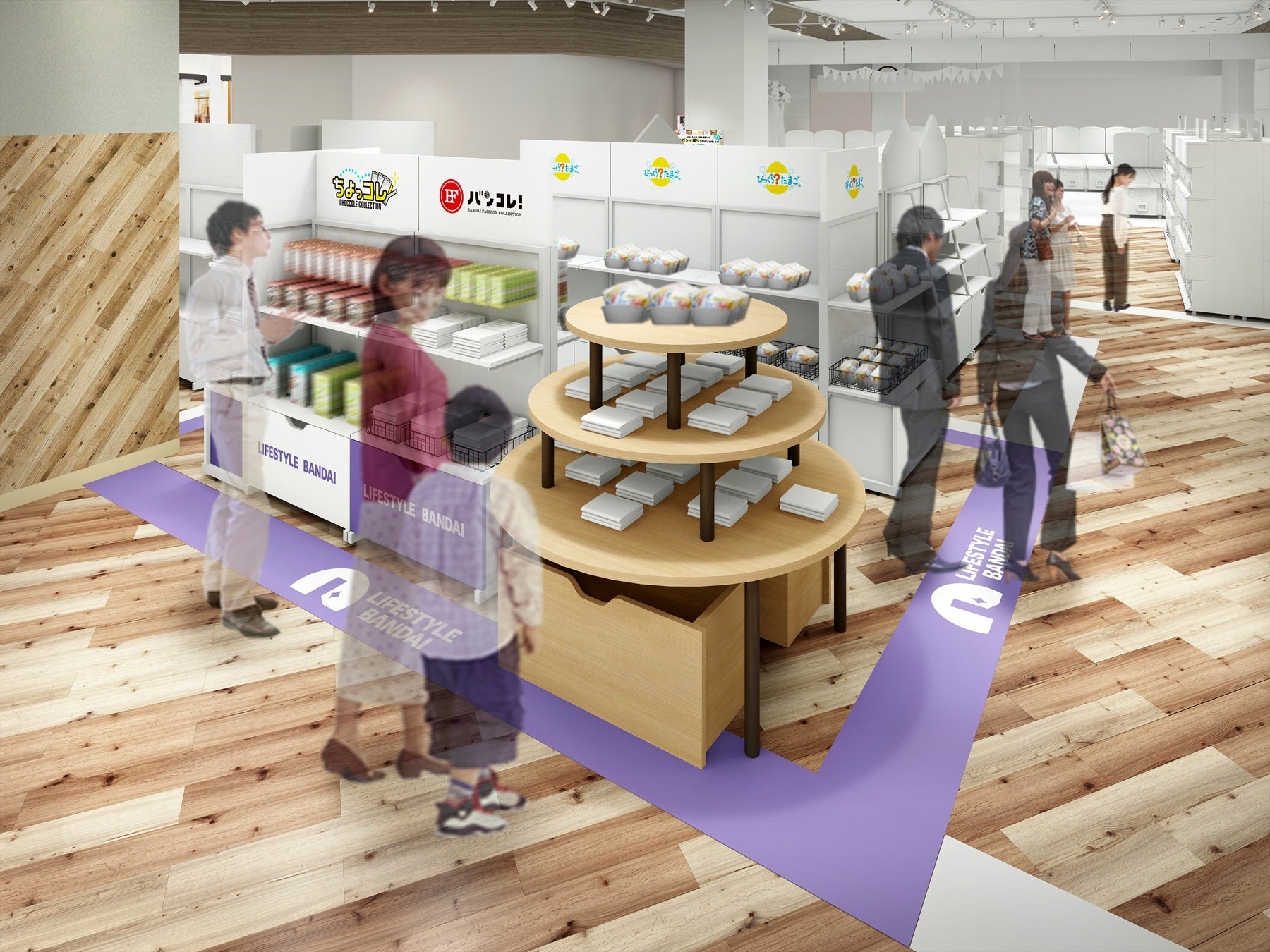 さまざまなキャラクターの雑貨やアパレルアイテムが集合する<バンコレ!>やキャラクターコスメの<クレアボーテ>、コレクションアイテムの<ちょっコレ>、入浴剤からマスコットが飛び出す<びっくらたまご>がリアル店舗で登場!