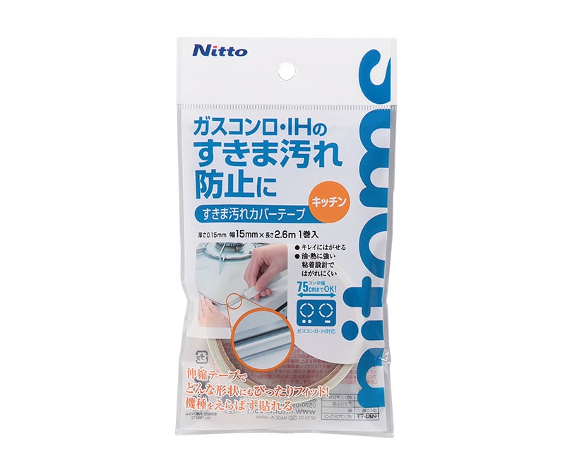 特長 | ・テープを貼るだけで、ガスコンロやIHクッキングヒーターのすきま汚れを防止できる ・テープが透明で目立たたない ・伸縮性があるのでコーナー部分にもフィットし、 ・作業時に貼り直しができるので、位置がずれないように調整しながら貼れる ・貼りつけた後は、しっかりくっつき、きれいにはがせる ・油や熱に強い・幅75cm以下のビルトインタイプのガスコンロ、IHクッキングヒーターに使える |