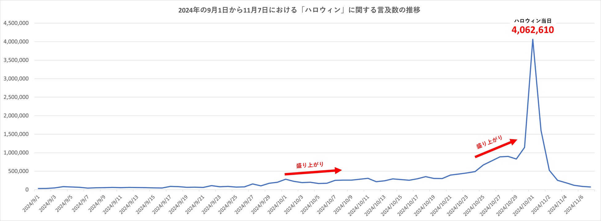 詳細な数字の動きとしては、9月1日~26日は3千件~10万件となり、9月27日に約15万件を超えました。その後もハロウィン当日に向かってじわじわと言及数は増えていき、10月25日は67万件を超えています。