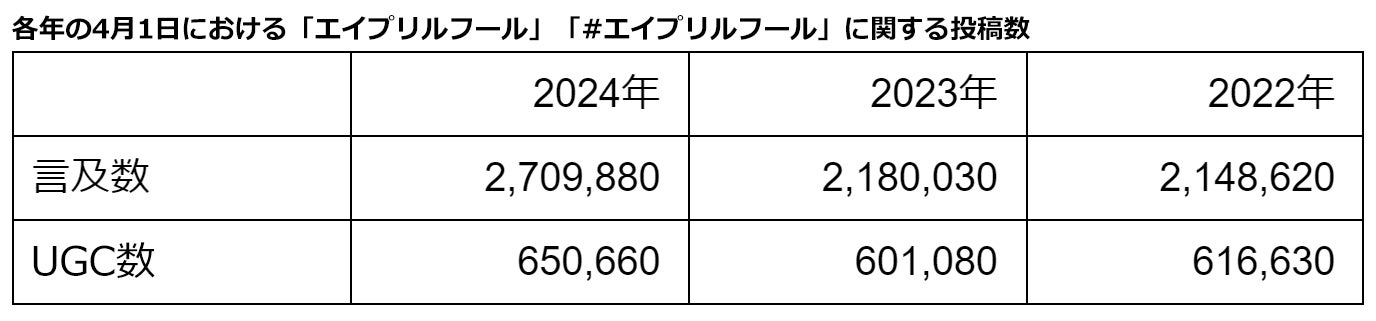 ※対象メディア:Twitterデータ(10%サンプリングデータを利用。記載の数値は10倍表記)、抽出キーワード:エイプリルフール,#エイプリルフール。抽出期間:2024年4月1日,2023年4月1日,2022年4月1日