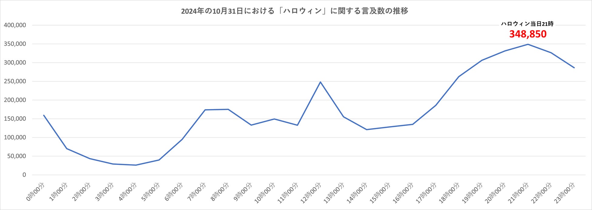 次に、2024年のハロウィン当日における「ハロウィン」に関する言及数の推移を調べました。
