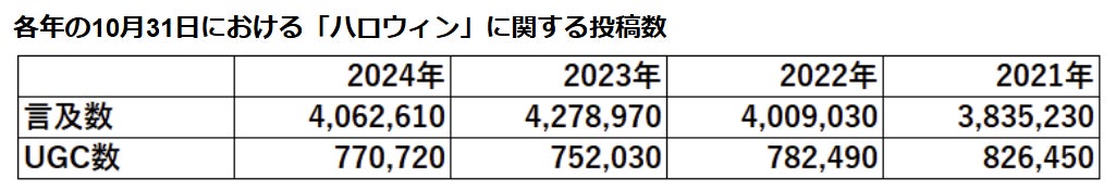 ※対象メディア:Twitterデータ(10%サンプリングデータを利用。記載の数値は10倍表記)、抽出キーワード:ハロウィン,#ハロウィン,ハロウィーン,#ハロウィーン、抽出期間:2024年10月31日,2023年10月31日,2022年10月31日,2021年10月31日