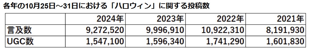 ※対象メディア:Twitterデータ(10%サンプリングデータを利用。記載の数値は10倍表記)、抽出キーワード:ハロウィン,#ハロウィン,ハロウィーン,#ハロウィーン、抽出期間:2024年10月25~31日,2023年10月25~31日,2022年10月25~31日,2021年10月25~31日