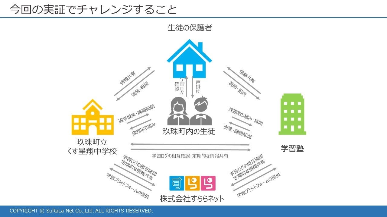 今回の「未来の教室」実証事業(テーマD:「学習ログ利活用」の実現に関するテーマ)では、大分県玖珠町立くす星翔中学校と学習塾において、生徒の「すらら」「すららドリル」上の学習ログを連携・共有し、生徒の学力向上を双方向から支援できる環境づくりを目指します。