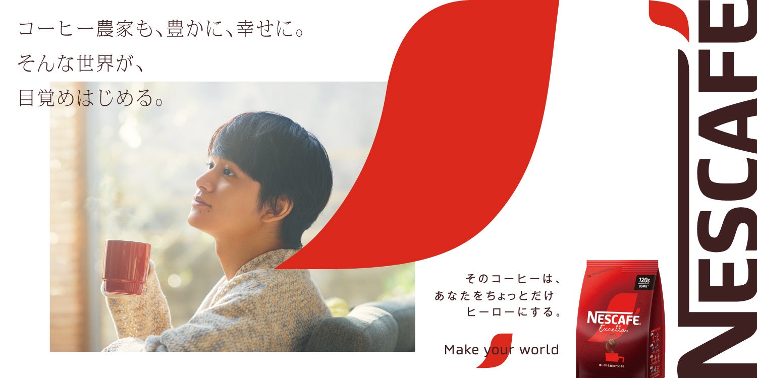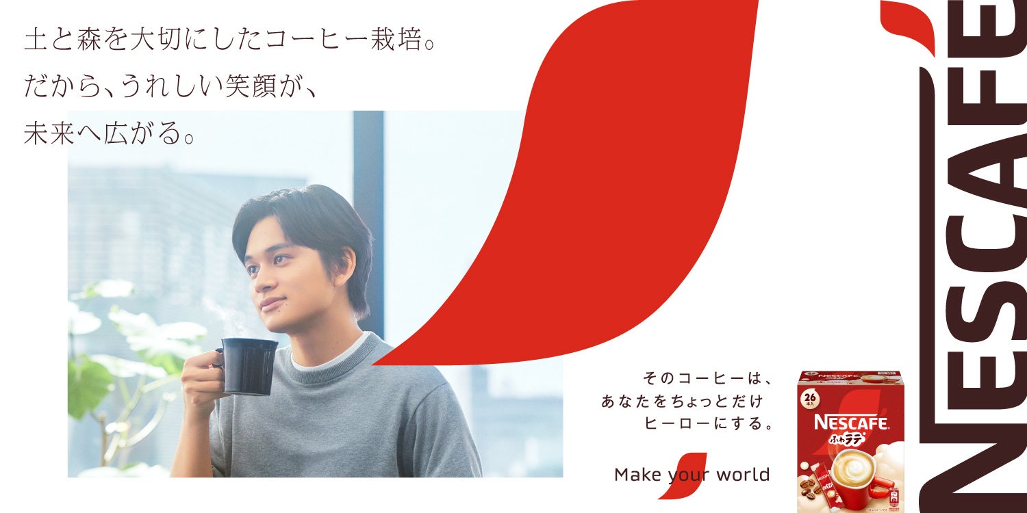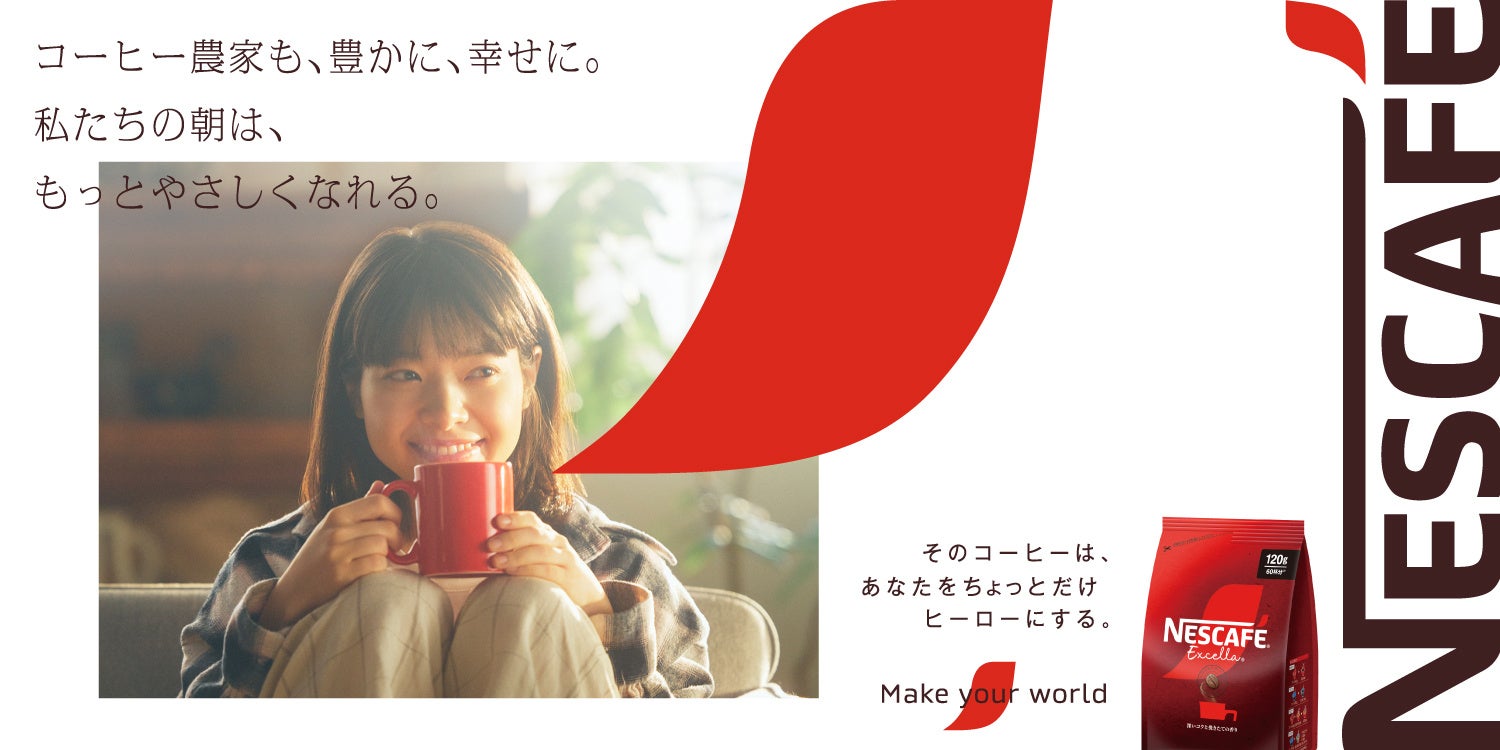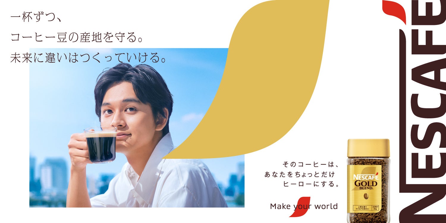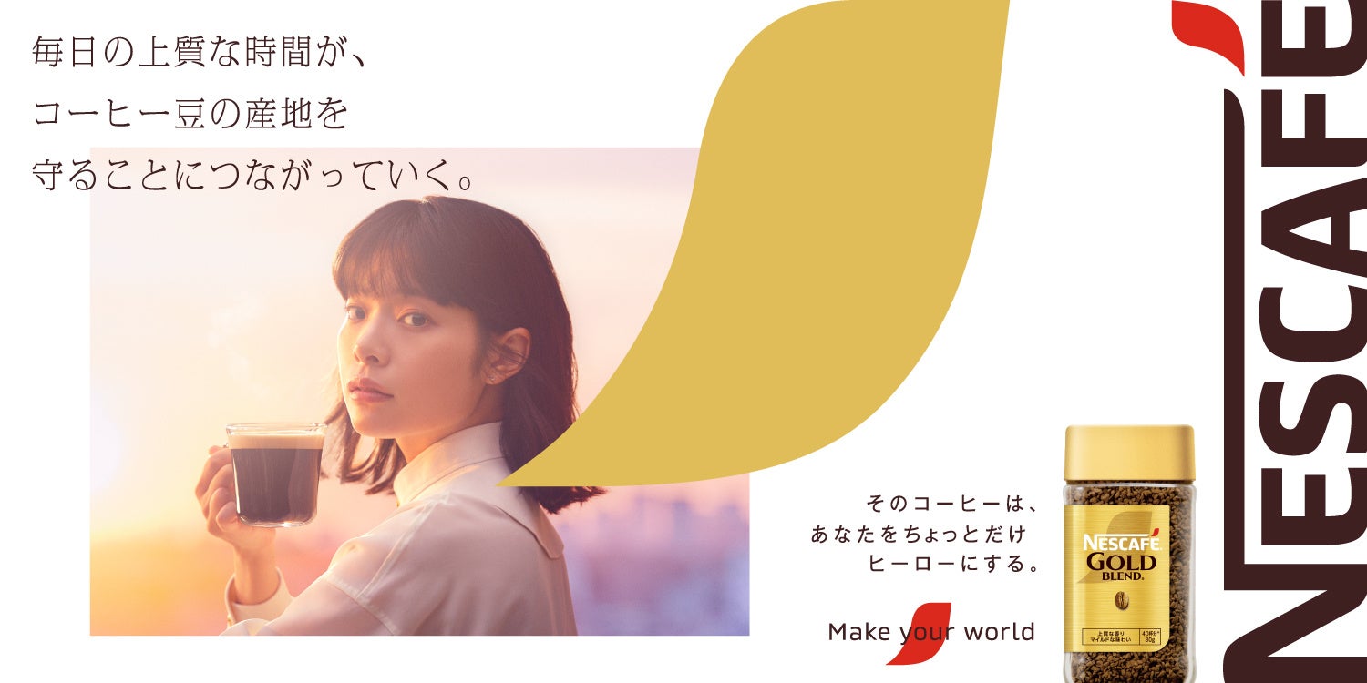 「ネスカフェ」の新コンセプト“Make your world”は、これからも皆様がおいしいコーヒーを飲み続けられる未来のために、グローバルコーヒーブランド「ネスカフェ」を通じてサステナビリティに取り組むことをネスレが表明するものです。“Make your world”を掲げた新ブランドコミュニケーションは2023年より世界各国で開始しており、これからも香りや味わいにこだわったおいしいコーヒーを皆様にお届けすること、また、皆様がコーヒーを選ぶ際に、生産者や環境に配慮して作られたコーヒー豆を使った一杯を選ぶことが“自分やその周りの世界を変える”きっかけとなることを伝えています。