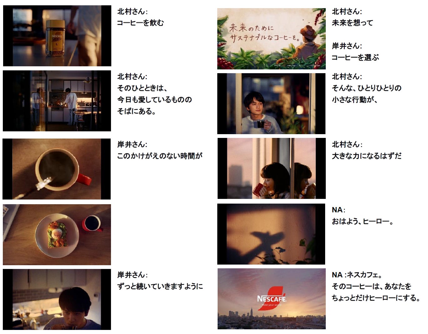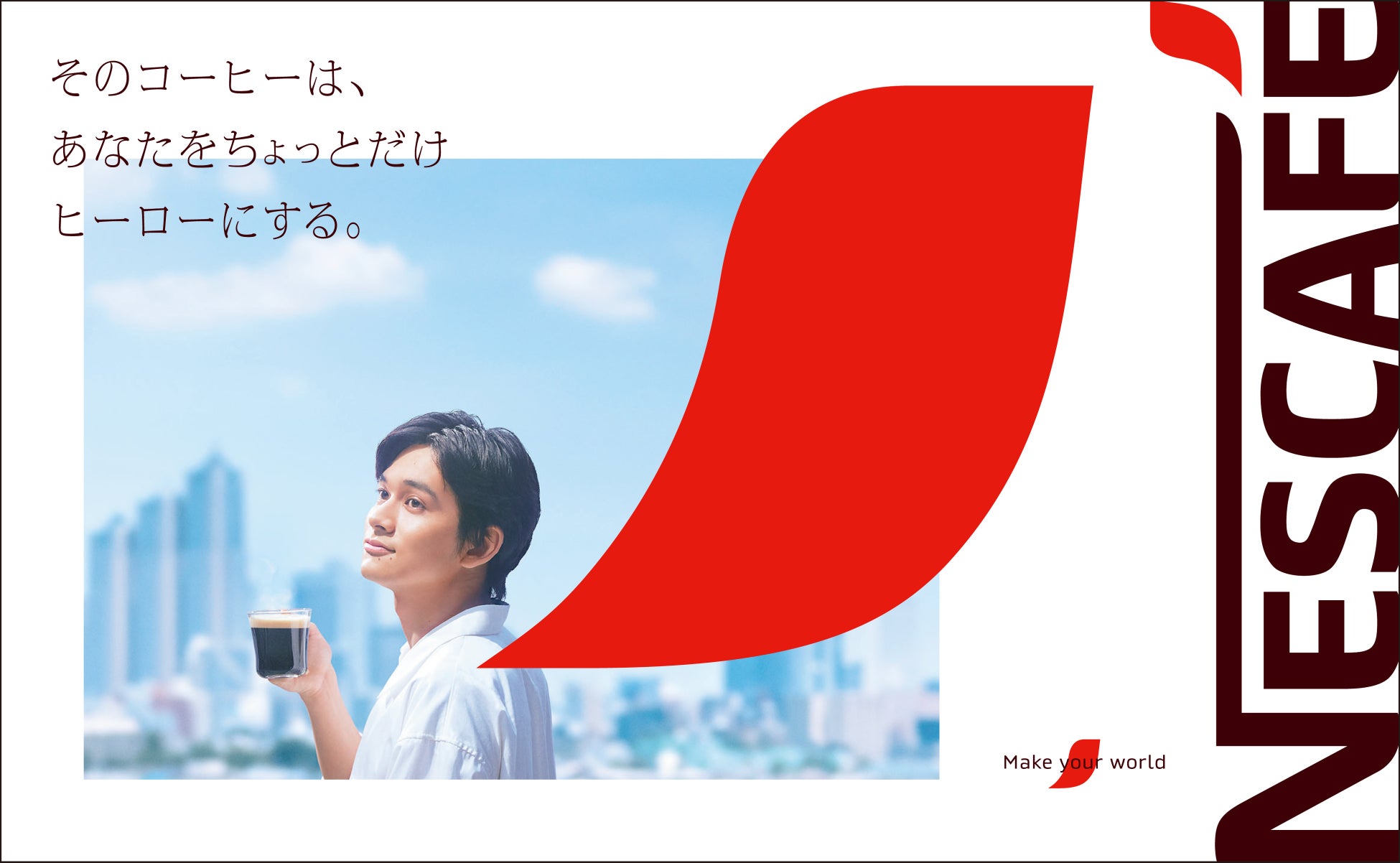 いつものコーヒーを「ネスカフェ」にするだけで、誰もが簡単にちょっとだけ世界を良くすることに貢献できるという考えに、既存のネスカフェ ユーザーだけではなく未来の世代からも共感を得るために、次世代を担う世代の象徴且つ謙虚な“ヒーロー”を表現できる人物として、俳優の北村 匠海さん、岸井 ゆきのさんの二人を起用しました。「ネスカフェ」の新ブランドメッセージ“そのコーヒーは、あなたをちょっとだけヒーローにする。”のもとで伝えるサステナブルな未来に向けた想いはもちろんのこと、「ヒーロー」にちなんで「ネスカフェ」のアクサン(※フランス語で「アクセント」の意味)マークがマントのように象徴的に使用されたラストシーンも見どころとなっています。