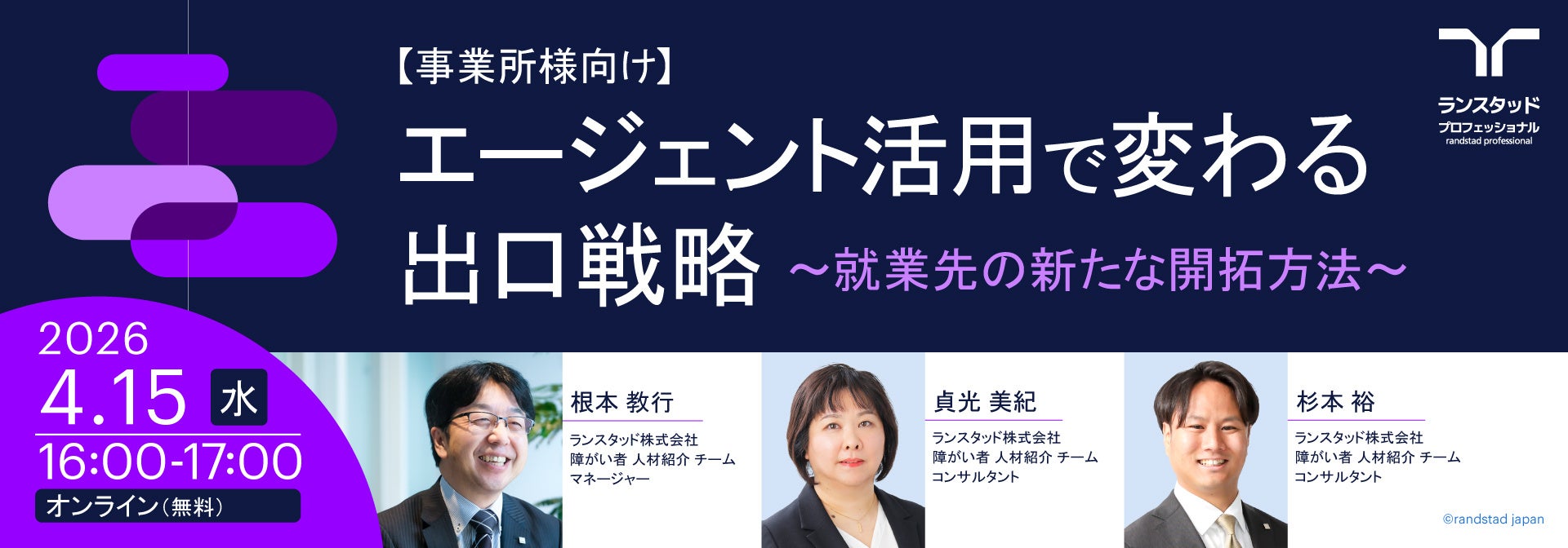 総合人材サービスを提供するランスタッド株式会社(本社:東京都千代田区 代表取締役会長兼CEO 道上 淳之介、代表取締役社長 猿谷 哲)は、2026年4月15日に就労移行支援事業所様向けの無料ウェビナーを開催いたします。2026年7月の法定雇用率引き上げ(2.7%)を目前に控え、企業が求める人材像の変化と、支援機関に求められる新たな役割について、最新の市場動向を交えて解説します。ランスタッドは自社の障がい者雇用を着実に促進することに加え、企業への障がい者人材の紹介事業も強化しており、今後も社会課題解決に貢献してまいります。