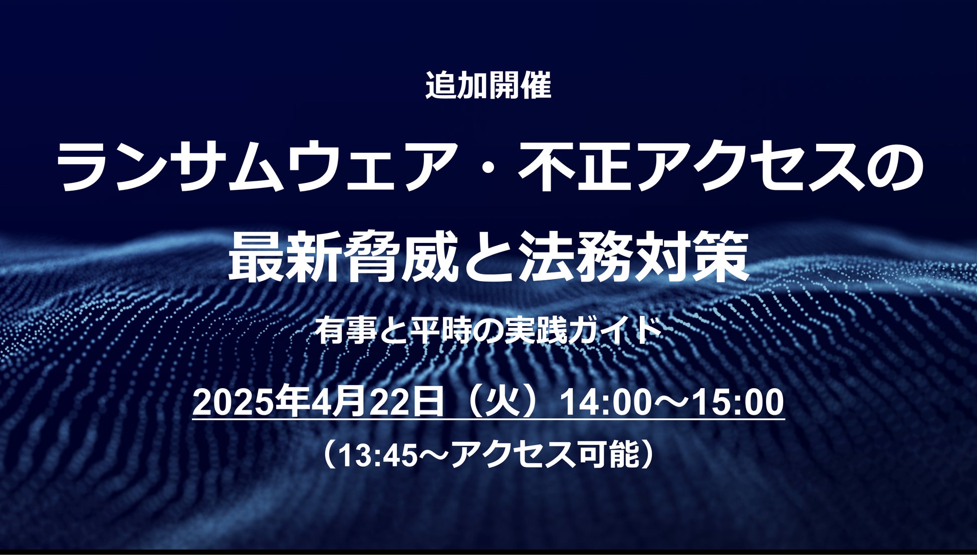 新入社員・部署異動が増える春こそ要警戒!Webセミナー「ランサムウェア・不正アクセスの最新脅威と法務対策」を4/22(火)に追加開催