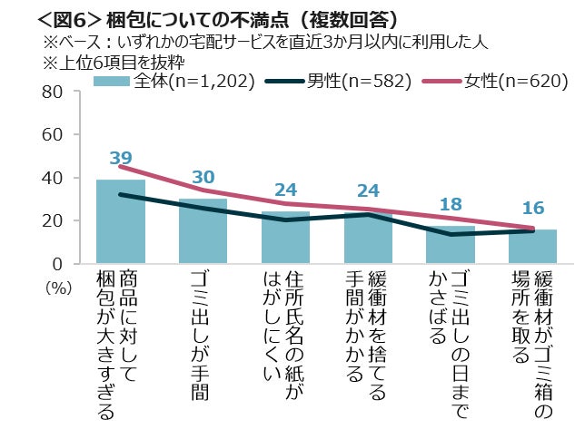 梱包についての不満点は「商品に対して梱包が大きすぎる」「ゴミ出しが手間」「住所氏名の紙がはがしにくい」「緩衝材を捨てる手間がかかる」などがあがった。特に女性ではいずれの不満点も高い。<図6>