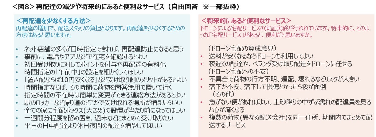再配達を少なくする方法として「日時指定の徹底」が多くあがった。そのために、指定時間を細かくする/宅配ボックスの設置/置き配優先や再配達の有料化の声があがった。ドローン宅配は、送料が安くなる/夜の配達が増える/ベランダで受け取れるといった期待がある一方、ドローンの不具合による落下、遅配、荷物の損傷を不安視する意見もみられた。<図8>