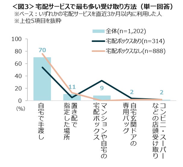 宅配サービスの受け取り方法は、「自宅で手渡し」が突出して高い。次いで「置き配」「宅配ボックス」。宅配ボックスのある家庭でも「自宅で手渡し」が最も多かった。<図3>