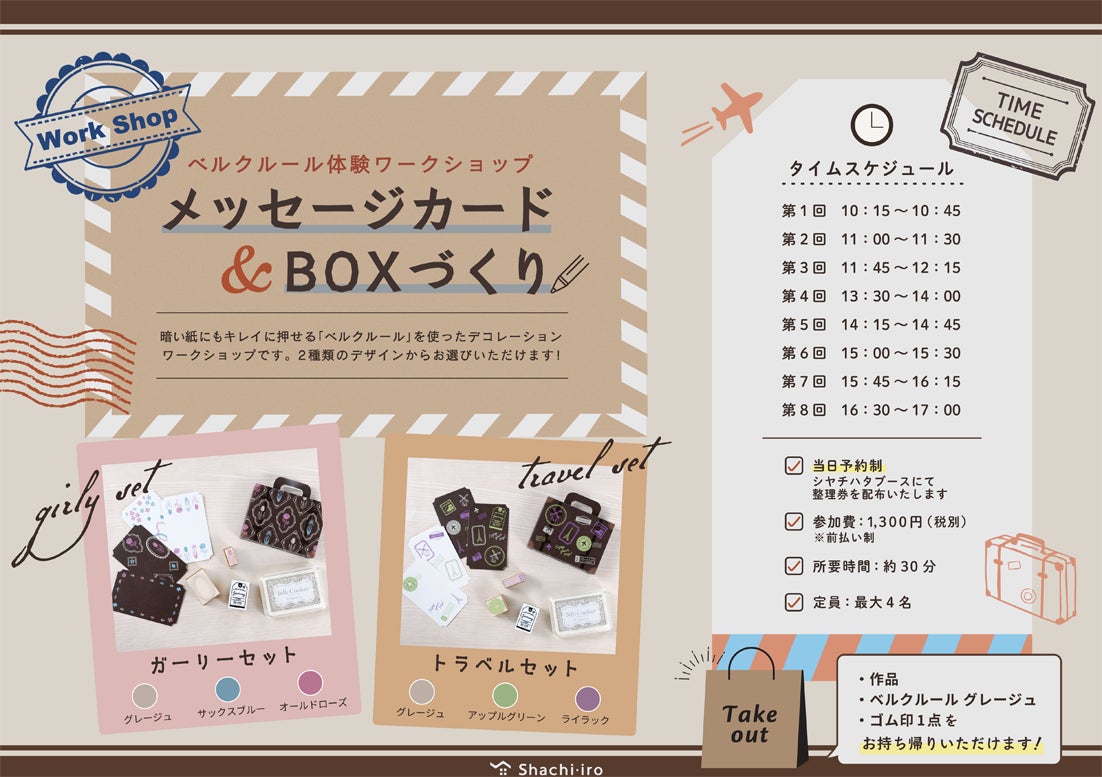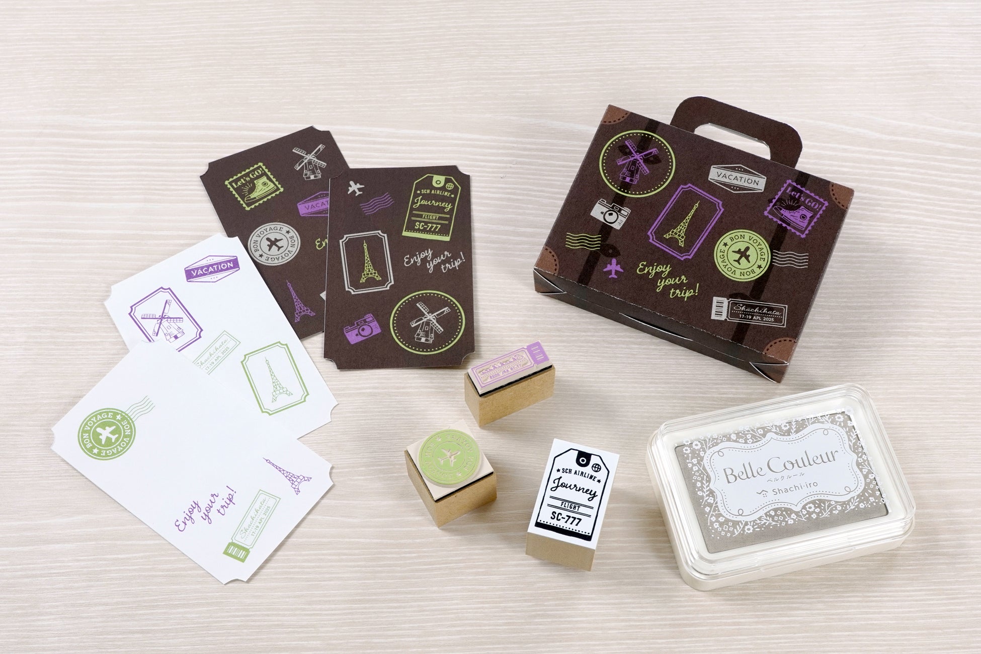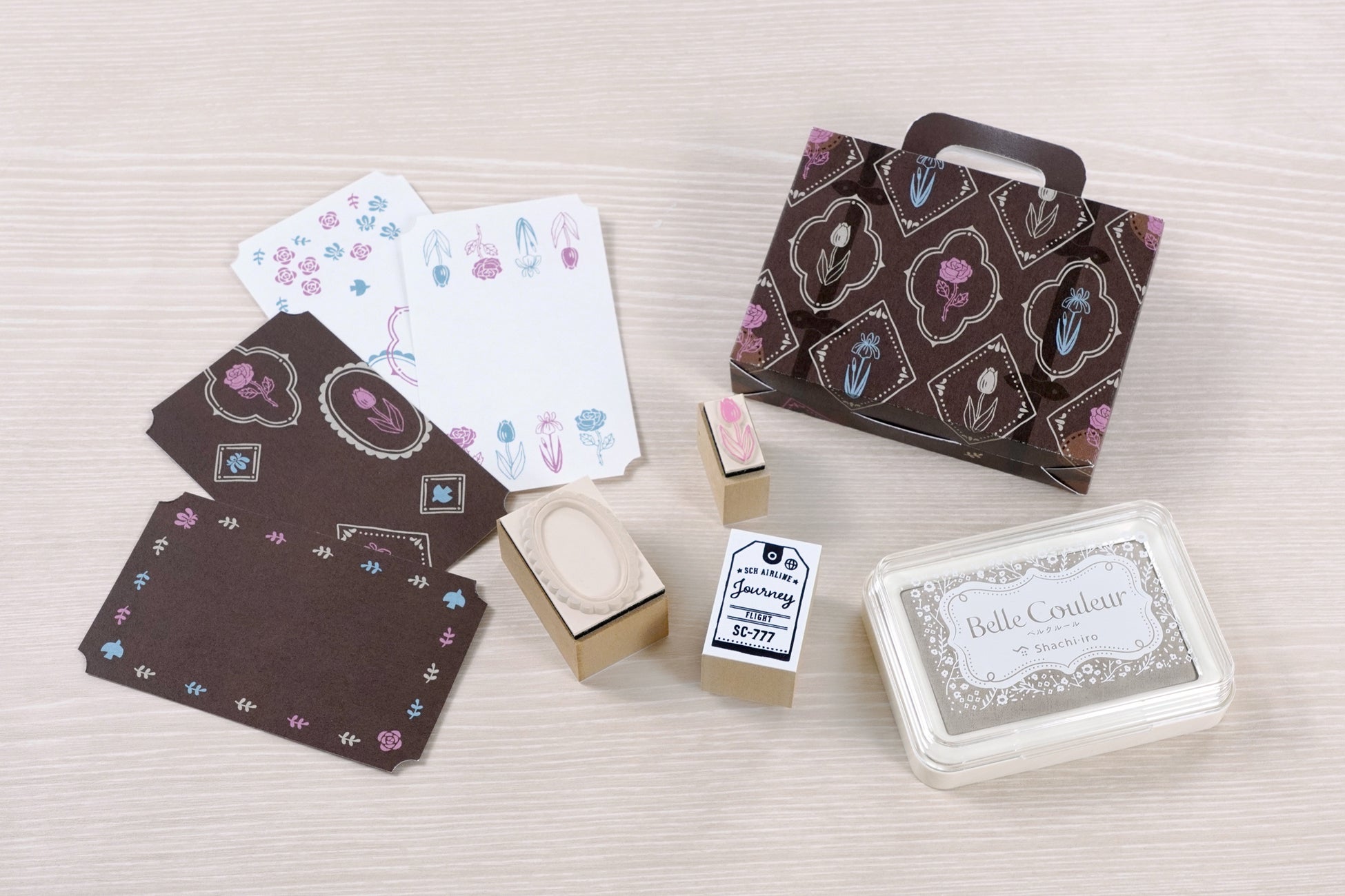 シヤチハタブースでは、シヤチハタ独自のナノテクノロジーから生まれたインキを採用し、濃色の紙にも鮮明に発色する新発売のスタンプパッド「ベルクルール」を使い、「HANDMADE Journey」をテーマにキャリングバッグ風メッセージBOX&メッセージカードづくり体験ができます。