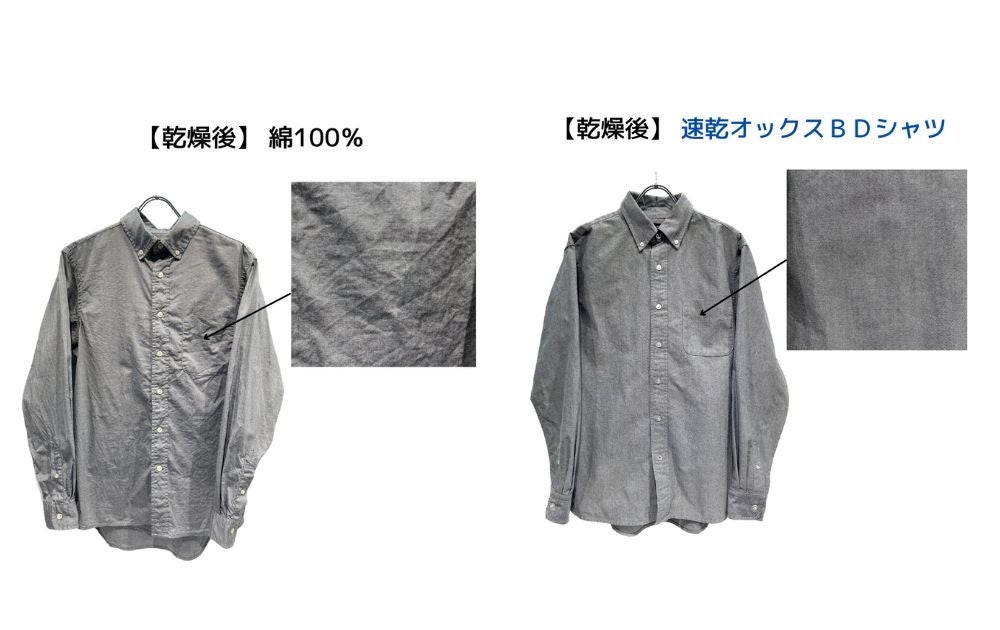 『速乾オックスボタンダウンシャツ』と同様の型で素材を綿100%に変更した商品との比較検証を行いました。