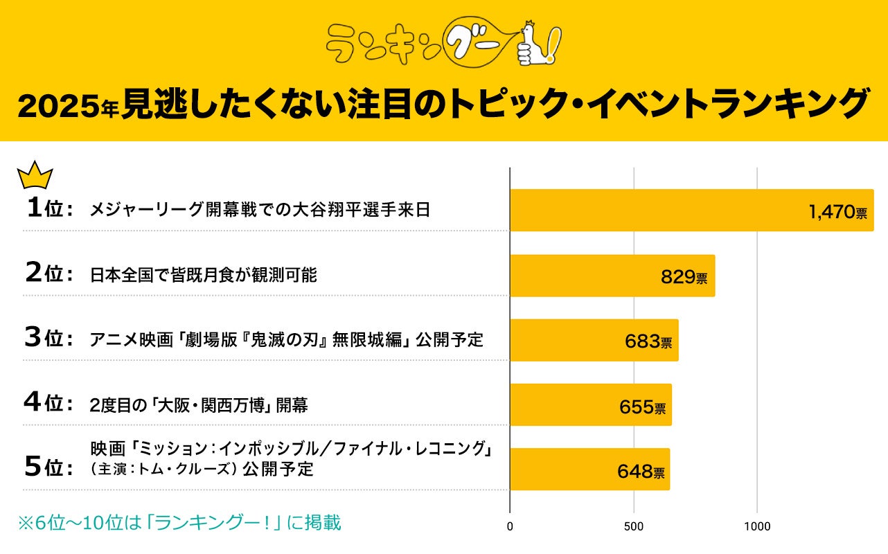 ランキングー!では2025年注目のトピック・イベントをピックアップし、ランキングを調査。全年代の男女(性別回答しないを含む)8,520名にアンケートを行い、TOP10を決定しました。ここではTOP5をご紹介します。